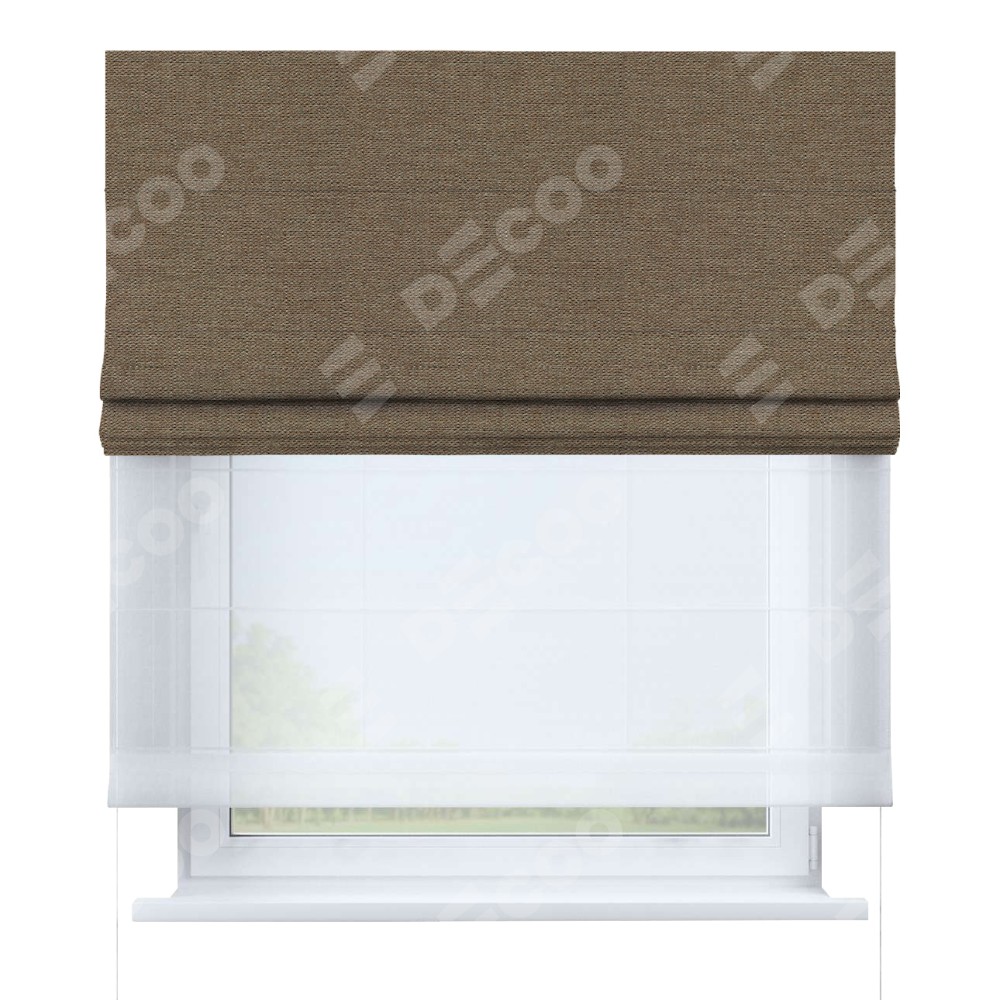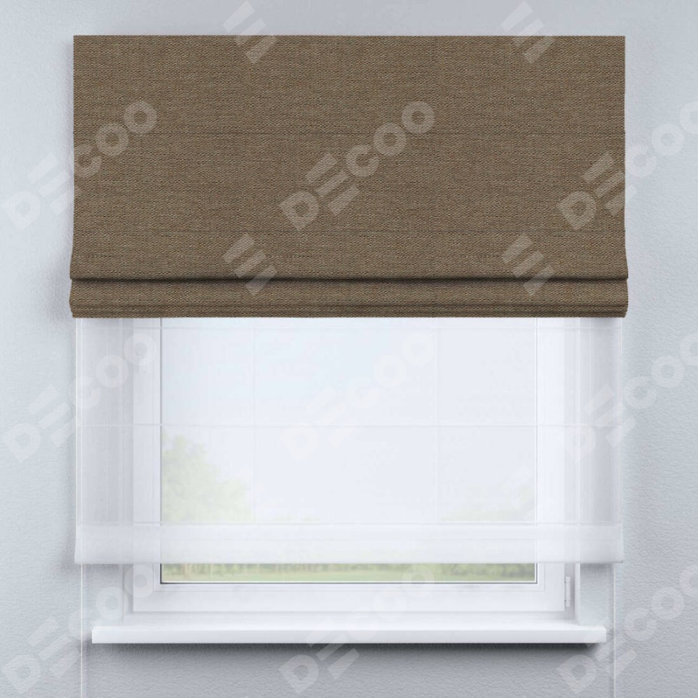 Римская штора день-ночь производителя «Cortin», используется для проёма, пошита из двух полотен, с лицевой стороны лён светло-коричневый артикул 53434, вторая ткань тюль (по стандарту комплектуется тюль белого цвета артикул V-01). Имеет универсальный механизм и подходит для монтажа: на потолок, на стену и в нишу.
