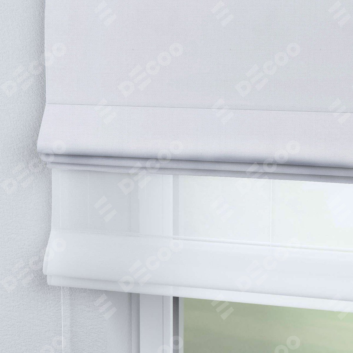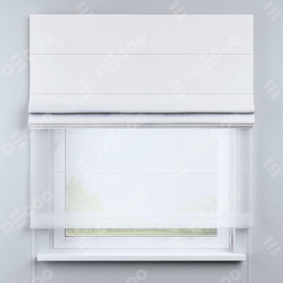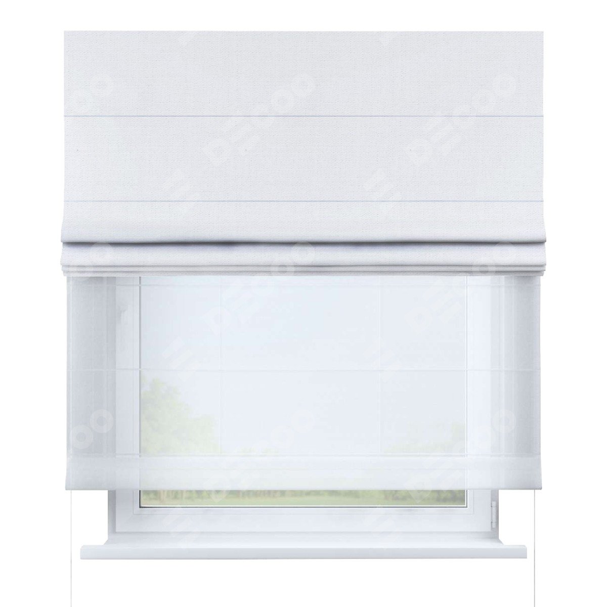 Римская штора день-ночь (двойная) от производителя «Cortin», используется для проёма. Пошита из двух полотен, основная ткань лён белый артикул 53430, вторая ткань тюль (по стандарту используется тюль белого цвета артикул V-01). Имеет универсальный механизм и подходит для монтажа: на потолок, на стену и в нишу.