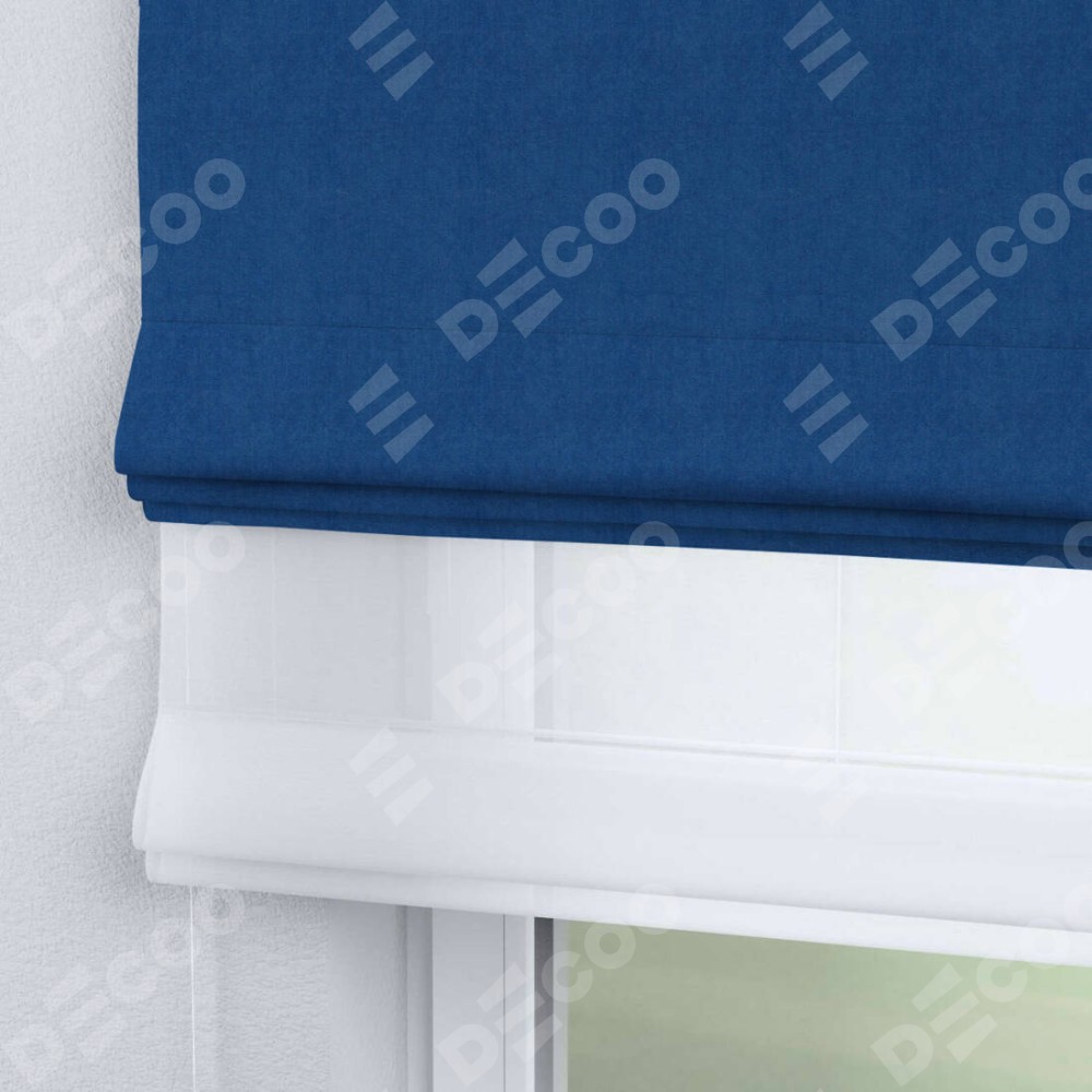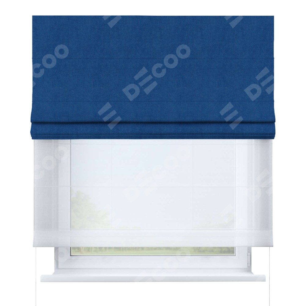 Римская штора день-ночь производителя «Cortin», используется для проёма, пошита из двух полотен, с лицевой стороны вельвет синий артикул 85554, вторая ткань тюль (по стандарту комплектуется тюль белого цвета артикул V-01). Имеет универсальный механизм и подходит для монтажа: на потолок, на стену и в нишу.