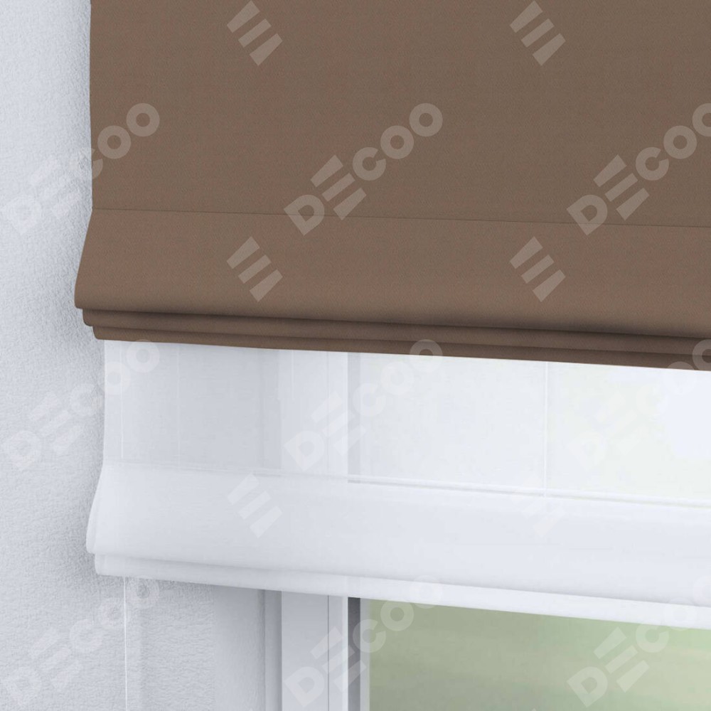 Римская штора день-ночь производителя «Cortin», используется для проёма, пошита из двух полотен, с лицевой стороны блэкаут однотонный коричневый артикул 88285, вторая ткань тюль (по стандарту комплектуется тюль белого цвета артикул V-01). Имеет универсальный механизм и подходит для монтажа: на потолок, на стену и в нишу.