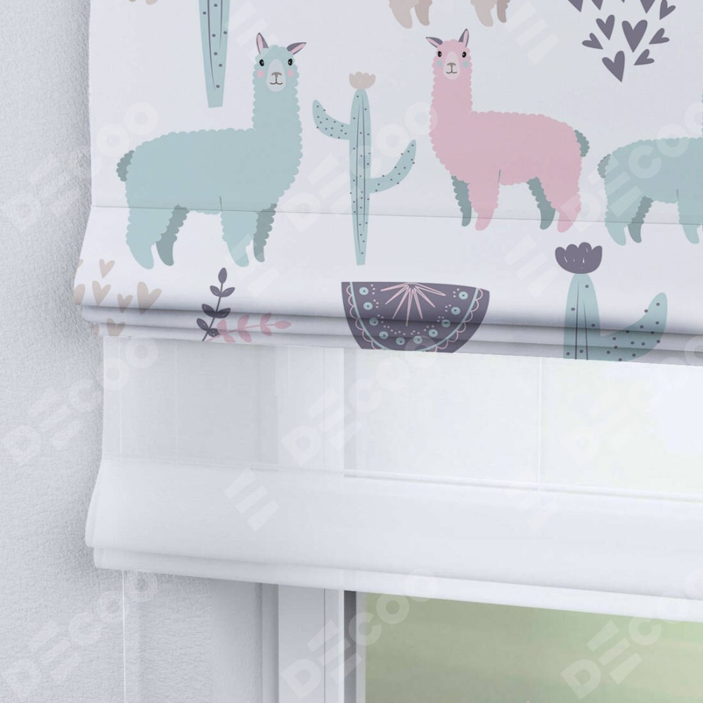 Римская штора день-ночь производителя «Cortin», используется для проёма, пошита из двух полотен, с лицевой блэкаут с нанесением сублимационной печати «Милый лама», вторая ткань тюль (по стандарту комплектуется тюль белого цвета артикул V-01). Имеет универсальный механизм и подходит для монтажа: на потолок, на стену и в нишу.