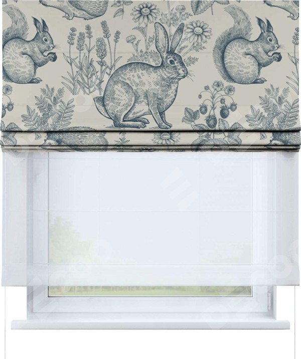 Римская штора день-ночь производителя «Cortin», используется для проёма, пошита из двух полотен, с лицевой блэкаут с нанесением сублимационной печати «На лугу», вторая ткань тюль (по стандарту комплектуется тюль белого цвета артикул V-01). Имеет универсальный механизм и подходит для монтажа: на потолок, на стену и в нишу.