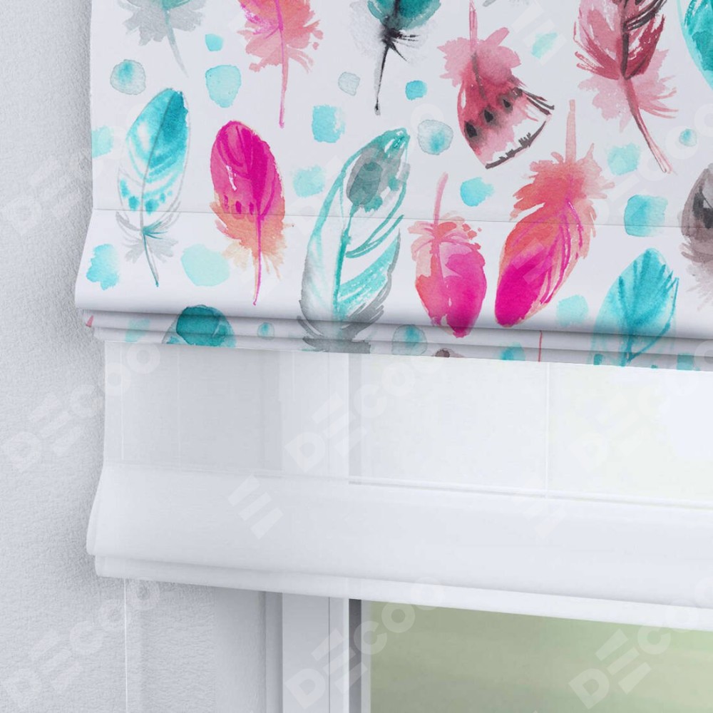 Римская штора день-ночь производителя «Cortin», используется для проёма, пошита из двух полотен, с лицевой блэкаут с нанесением сублимационной печати «Перья», вторая ткань тюль (по стандарту комплектуется тюль белого цвета артикул V-01). Имеет универсальный механизм и подходит для монтажа: на потолок, на стену и в нишу.