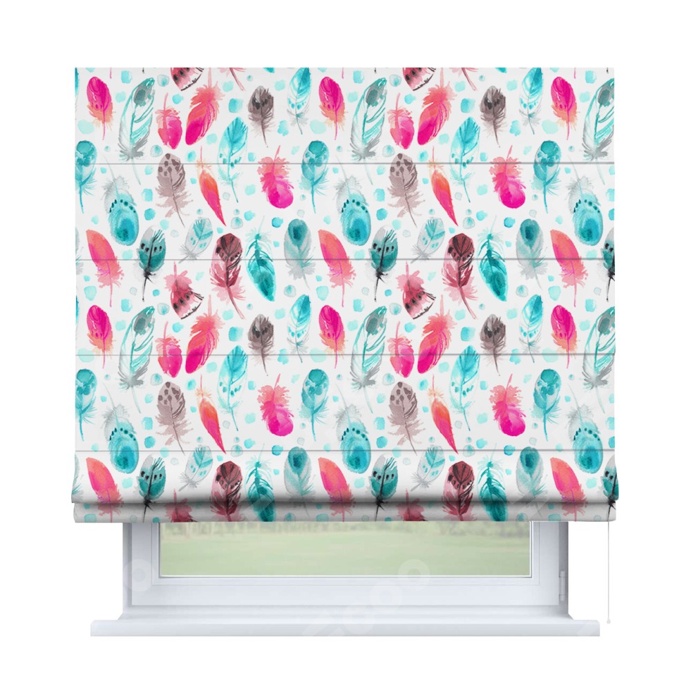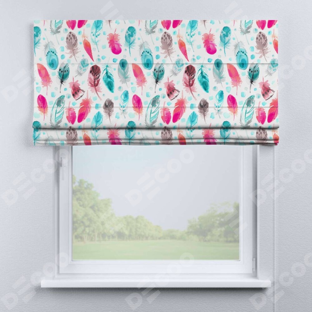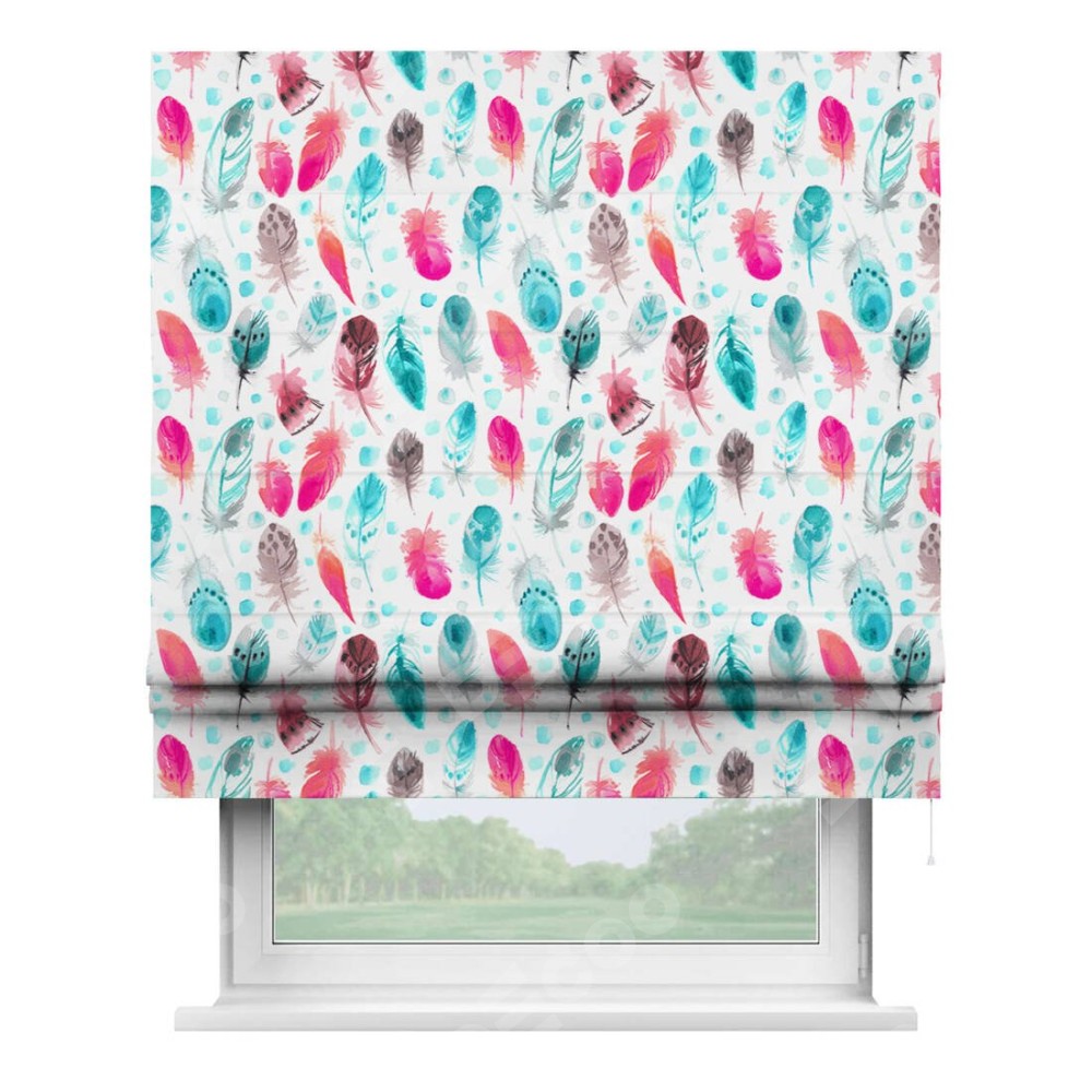 Римская штора производителя «Cortin», используется для проёма, пошита из ткани блэкаут с нанесением сублимационной печати «Перья». Имеет универсальный механизм и подходит для монтажа: на потолок, на стену и в нишу.