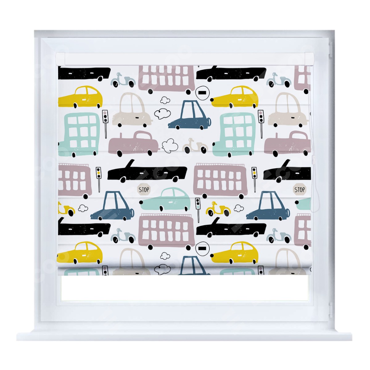 Римская штора кассетного типа, производителя «Cortin», устанавливается только на пластиковые окна и прилегает к стеклопакету, пошита из ткани блэкаут с нанесением сублимационной печати «Красочный трафик».