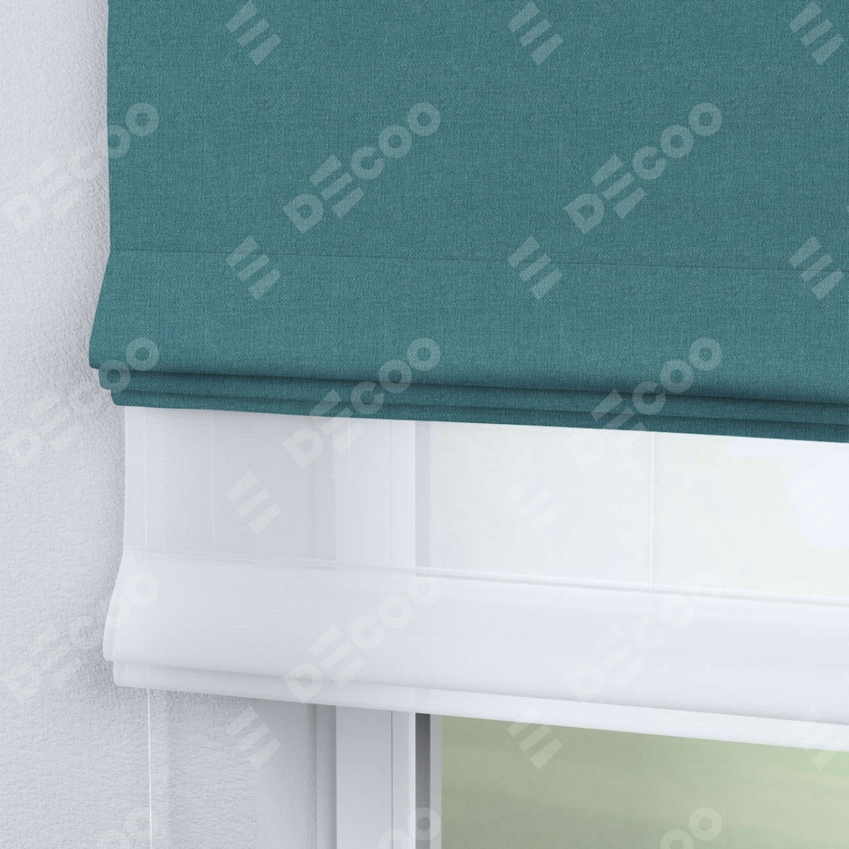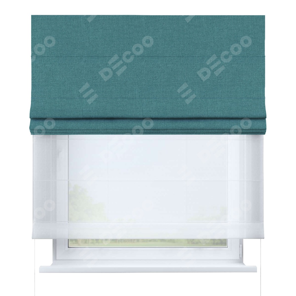 Римская штора день-ночь производителя «Cortin», используется для проёма, пошита из двух полотен, с лицевой стороны лён бирюзовый артикул 53436, вторая ткань тюль (по стандарту комплектуется тюль белого цвета артикул V-01). Имеет универсальный механизм и подходит для монтажа: на потолок, на стену и в нишу.