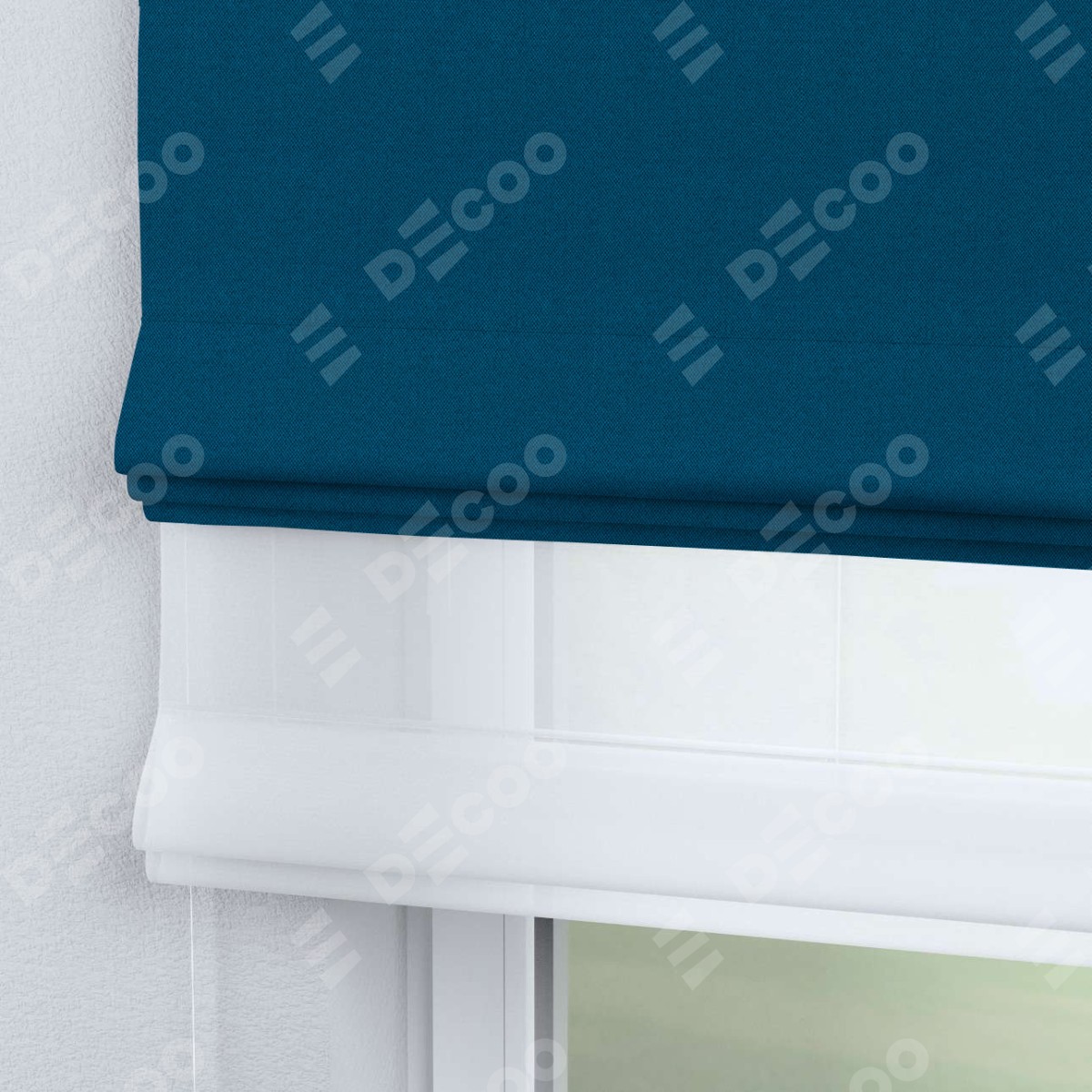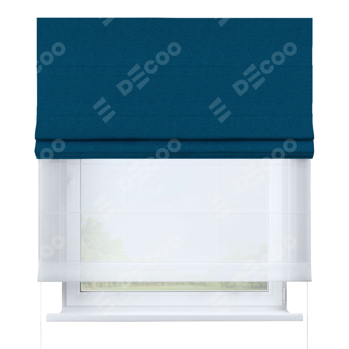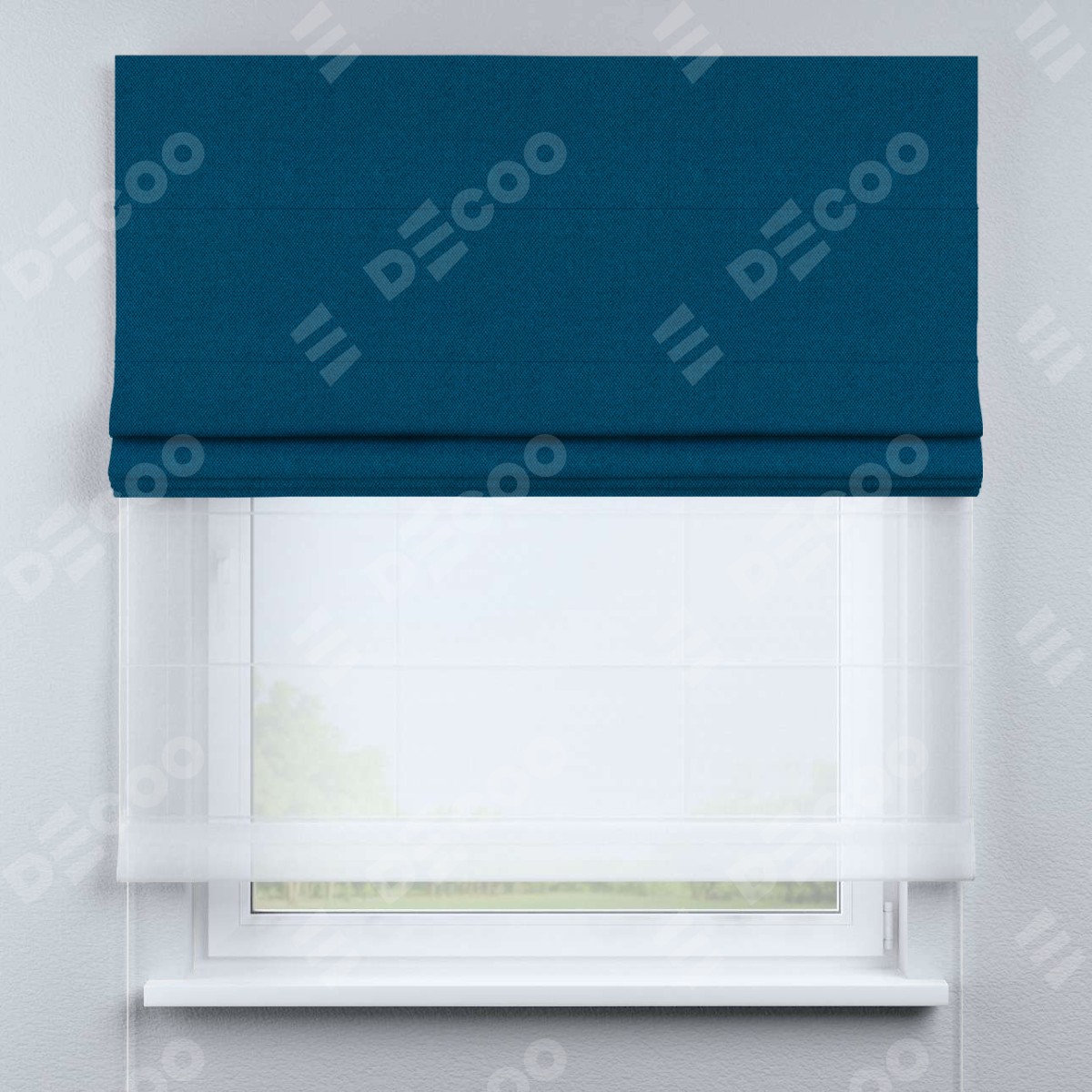 Римская штора день-ночь производителя «Cortin», используется для проёма, пошита из двух полотен, с лицевой стороны лён димаут синий артикул 16260, вторая ткань тюль (по стандарту комплектуется тюль белого цвета артикул V-01). Имеет универсальный механизм и подходит для монтажа: на потолок, на стену и в нишу.