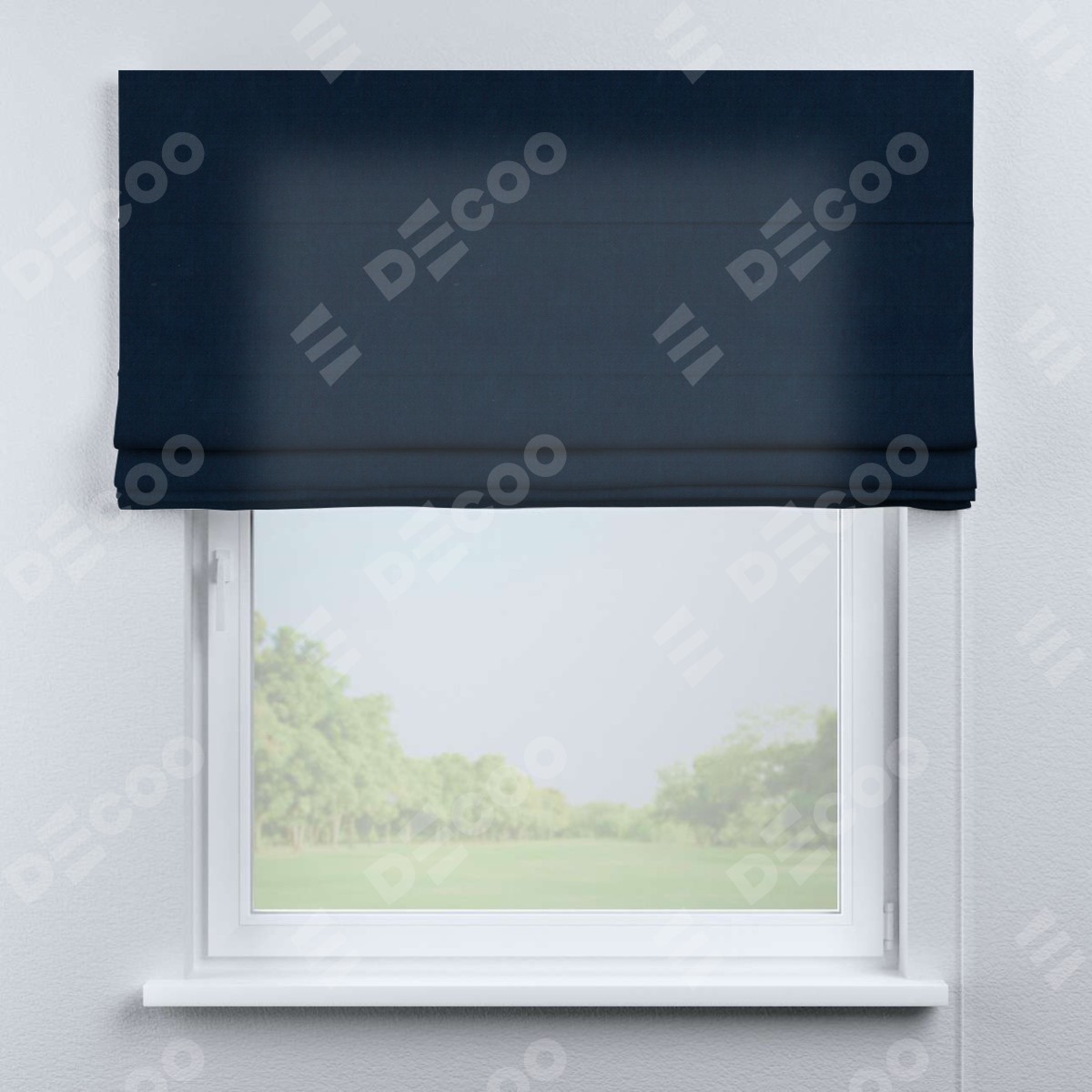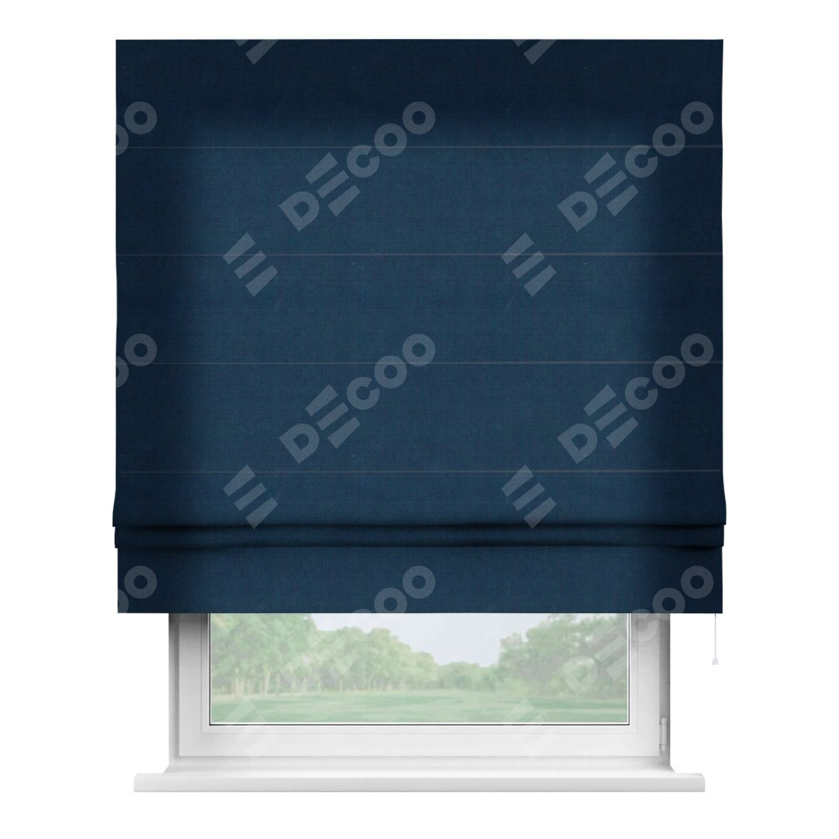 Римская штора производителя «Cortin», используется для проёма, пошита из ткани вельвет тёмно-синий, артикул ткани 14152. Имеет универсальный механизм и подходит для монтажа: на потолок, на стену и в нишу.