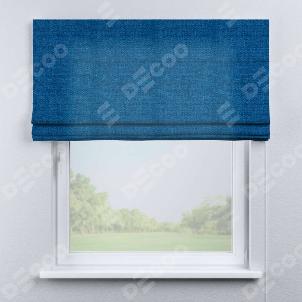 Римская штора производителя «Cortin», используется для проёма, пошита из ткани лён синий, артикул ткани 63742. Имеет универсальный механизм и подходит для монтажа: на потолок, на стену и в нишу.