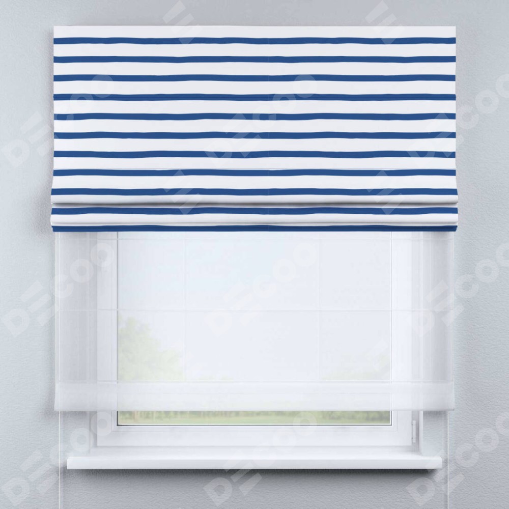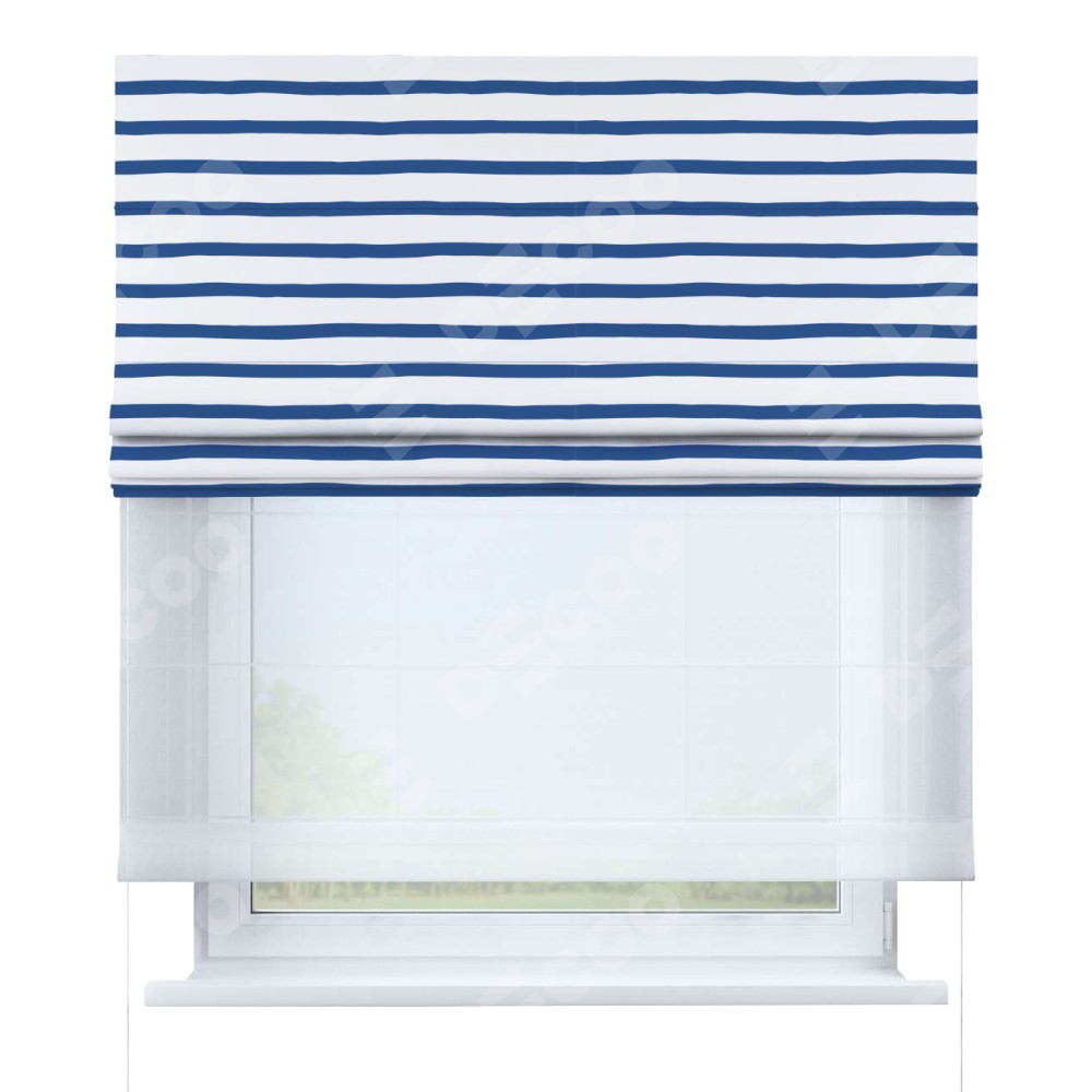 Римская штора день-ночь производителя «Cortin», используется для проёма, пошита из двух полотен, с лицевой блэкаут с нанесением сублимационной печати «Морская полоска», вторая ткань тюль (по стандарту комплектуется тюль белого цвета артикул V-01). Имеет универсальный механизм и подходит для монтажа: на потолок, на стену и в нишу.