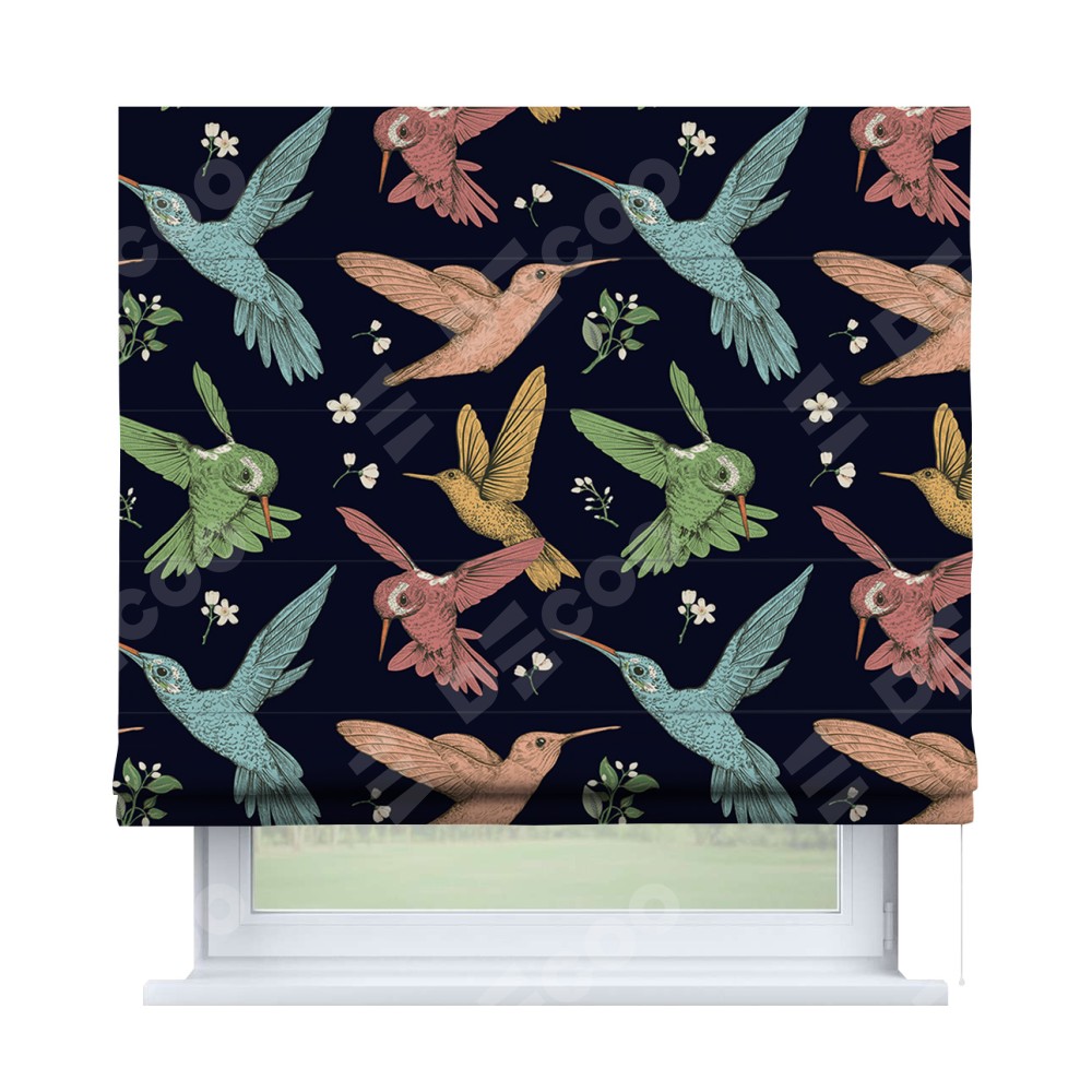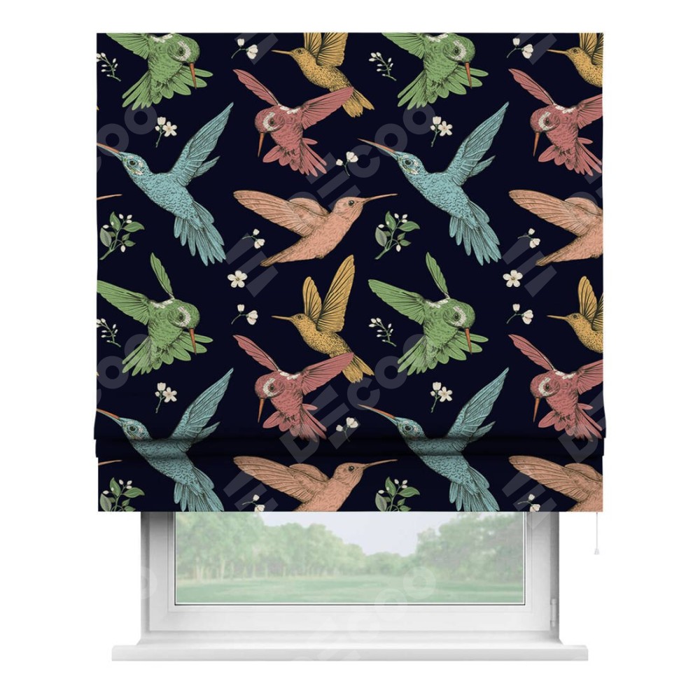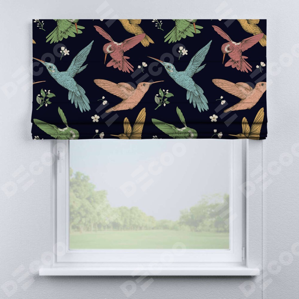 Римская штора производителя «Cortin», используется для проёма, пошита из ткани блэкаут с нанесением сублимационной печати «Птицы и цветы». Имеет универсальный механизм и подходит для монтажа: на потолок, на стену и в нишу.