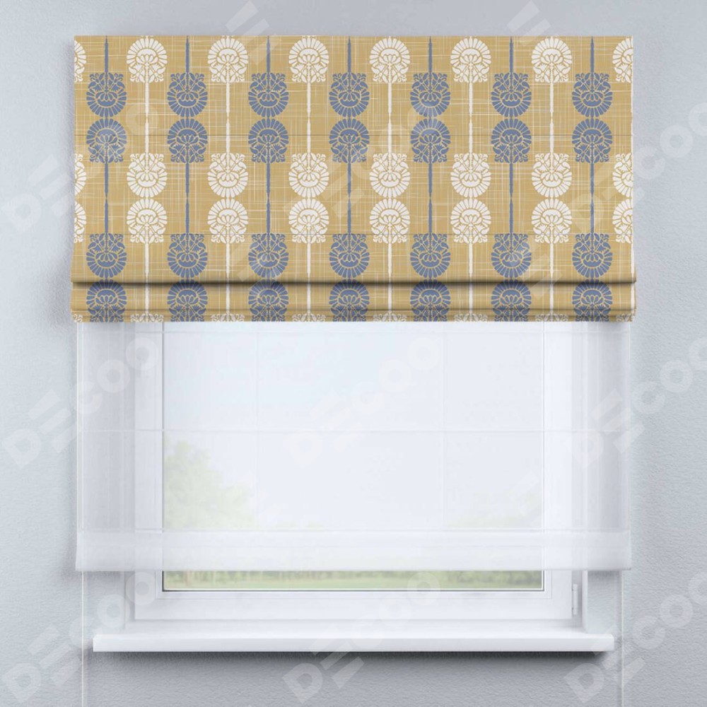 Римская штора день-ночь производителя «Cortin», используется для проёма, пошита из двух полотен, с лицевой блэкаут с нанесением сублимационной печати «Венок из ромашки», вторая ткань тюль (по стандарту комплектуется тюль белого цвета артикул V-01). Имеет универсальный механизм и подходит для монтажа: на потолок, на стену и в нишу.