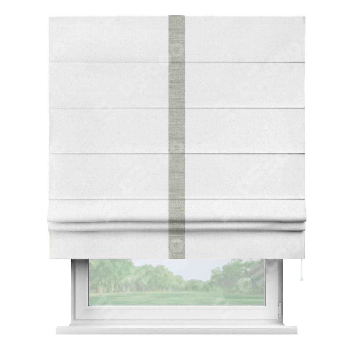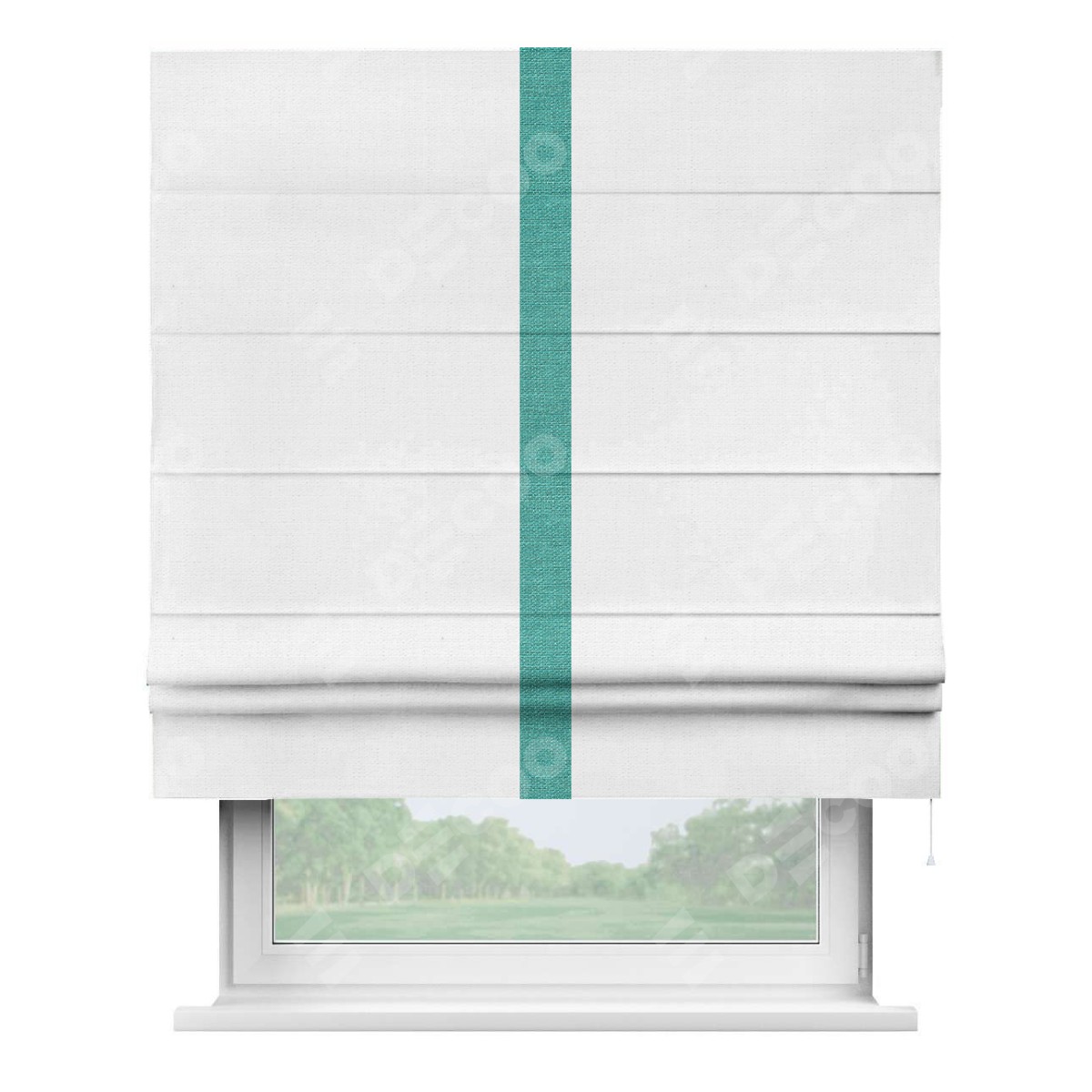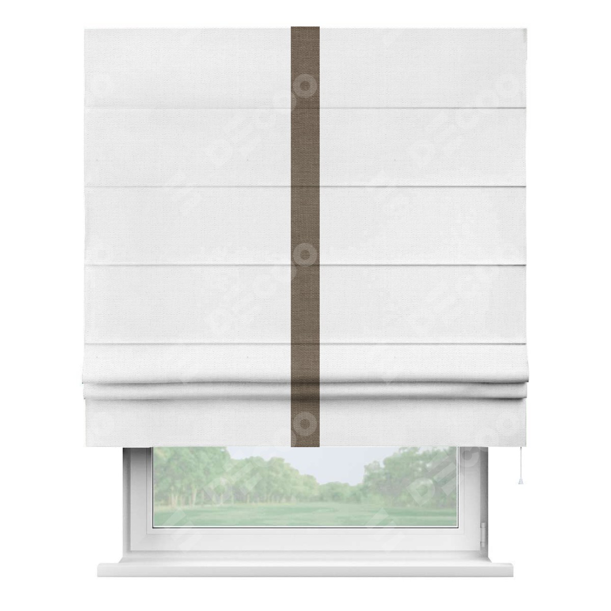 Римская штора производителя «Cortin», используется для проёма, пошита из ткани лён белый, артикул 53430. Отделка шторы кантом «Хайвэй», ткань для канта используется из льна разной расцветки на выбор. Имеет универсальный механизм и подходит для монтажа: на потолок, на стену и в нишу.
