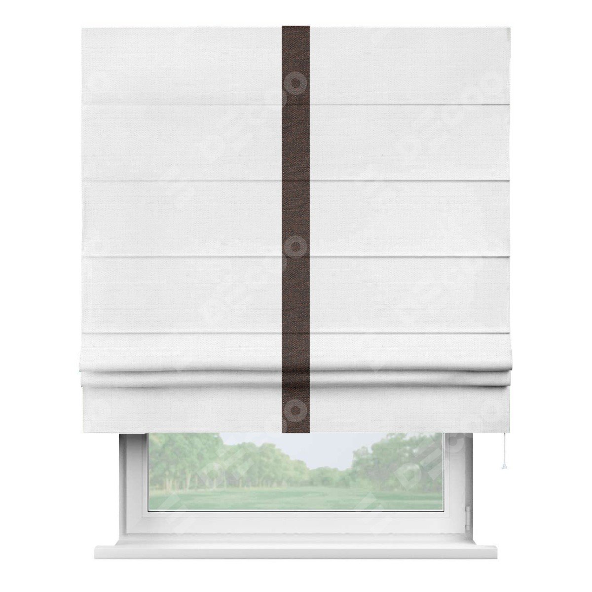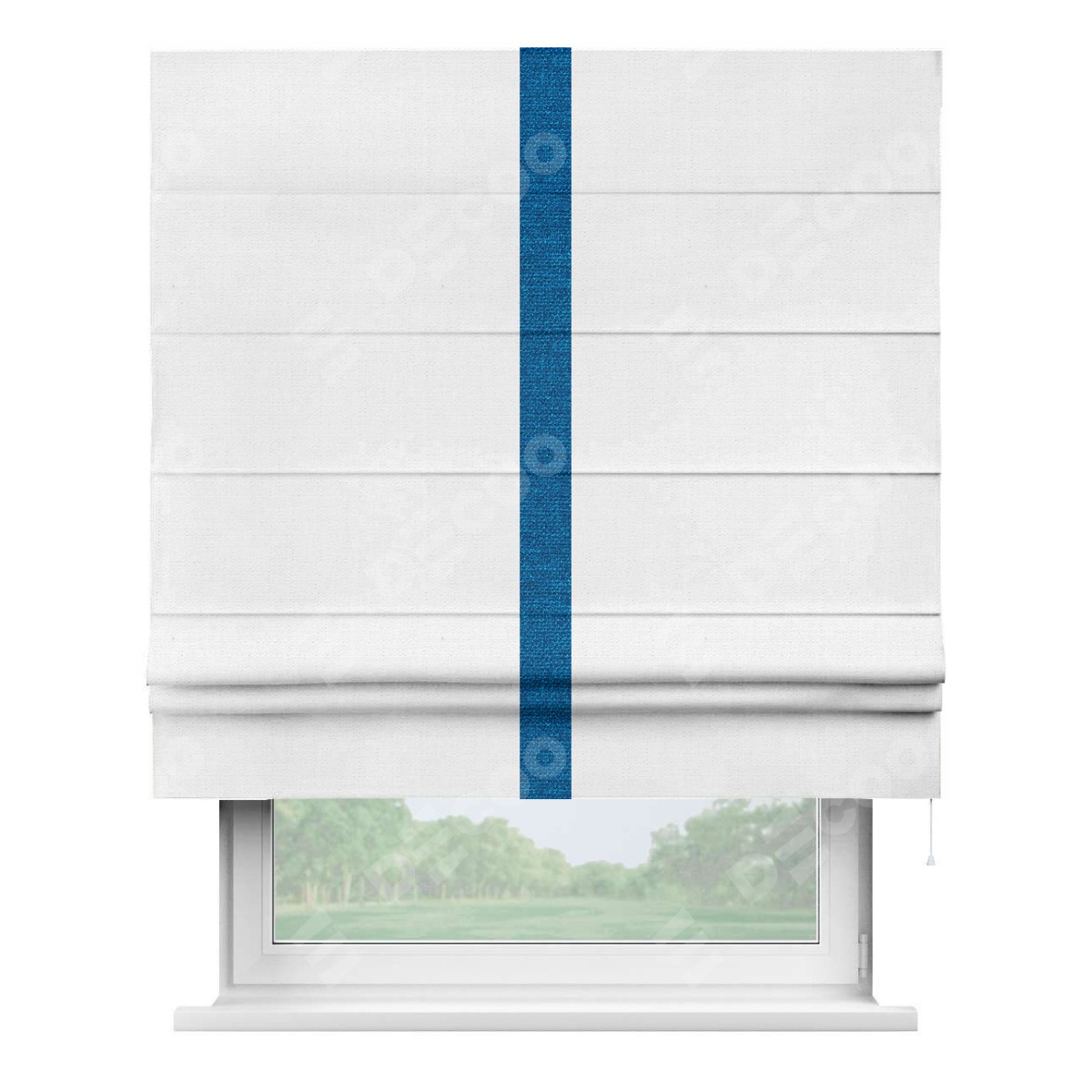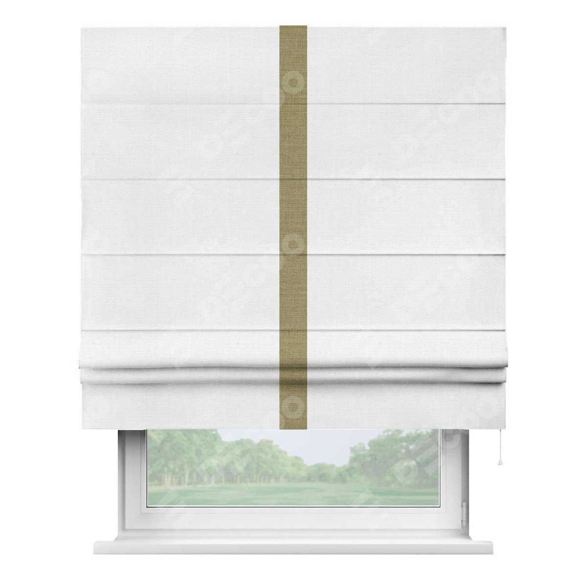 Римская штора производителя «Cortin», используется для проёма, пошита из ткани лён белый, артикул 53430. Отделка шторы кантом «Хайвэй», ткань для канта используется из льна разной расцветки на выбор. Имеет универсальный механизм и подходит для монтажа: на потолок, на стену и в нишу.