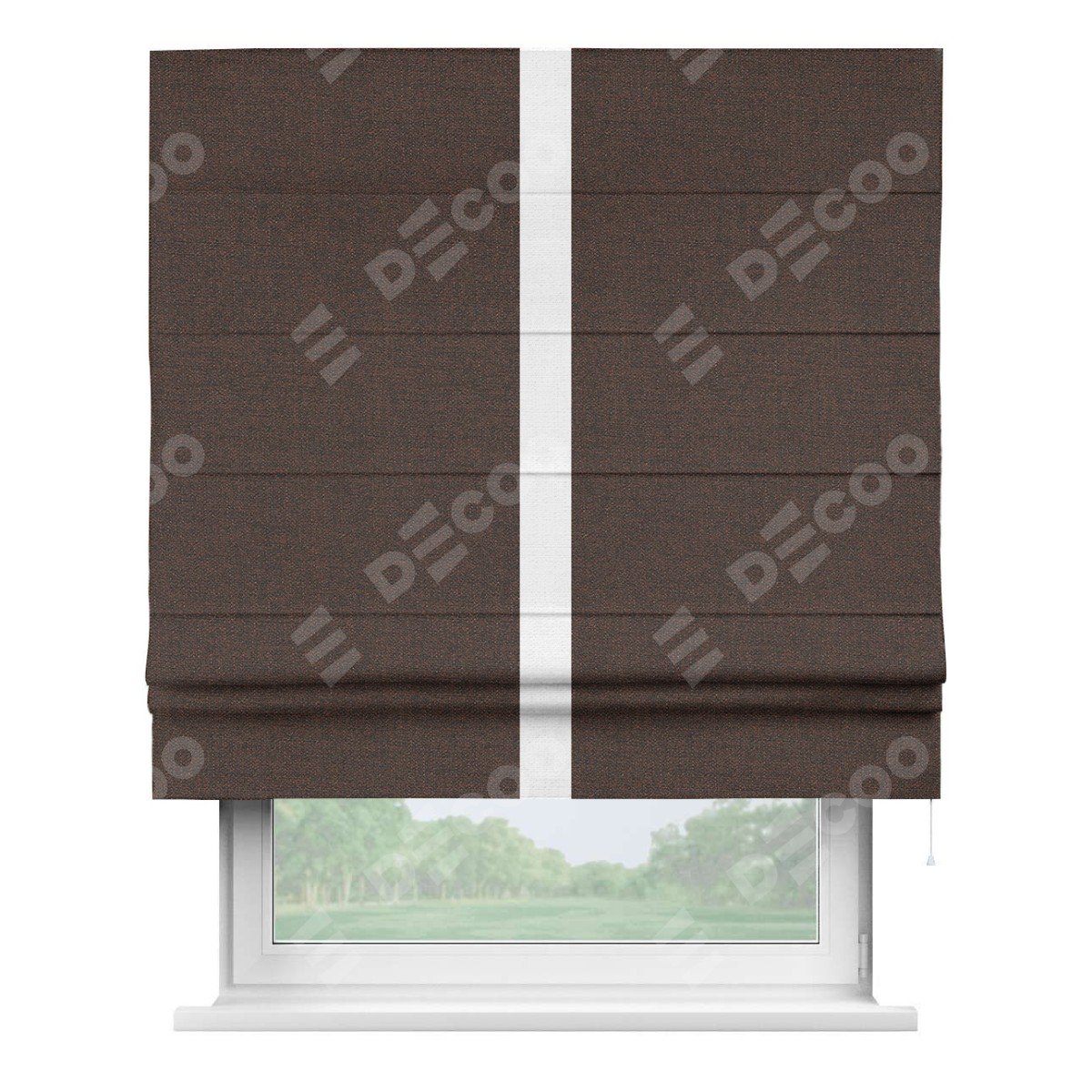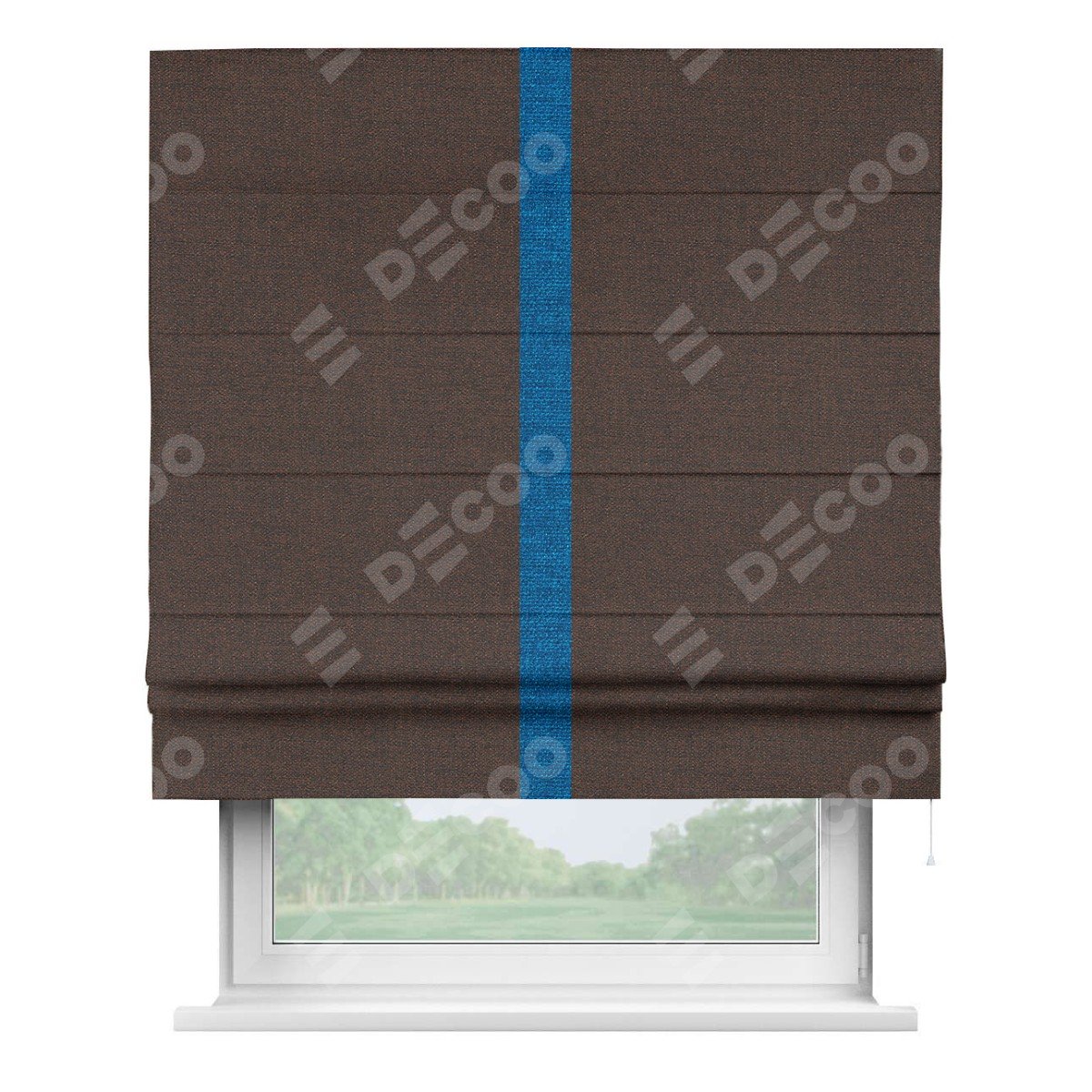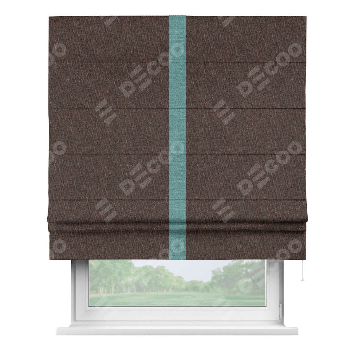 Римская штора производителя «Cortin», используется для проёма, пошита из ткани лён коричневый, артикул 53443. Отделка шторы кантом «Хайвэй», ткань для канта используется из льна разной расцветки на выбор. Имеет универсальный механизм и подходит для монтажа: на потолок, на стену и в нишу.
