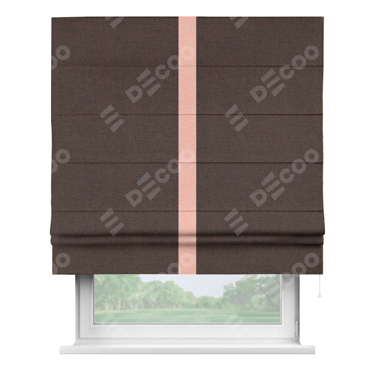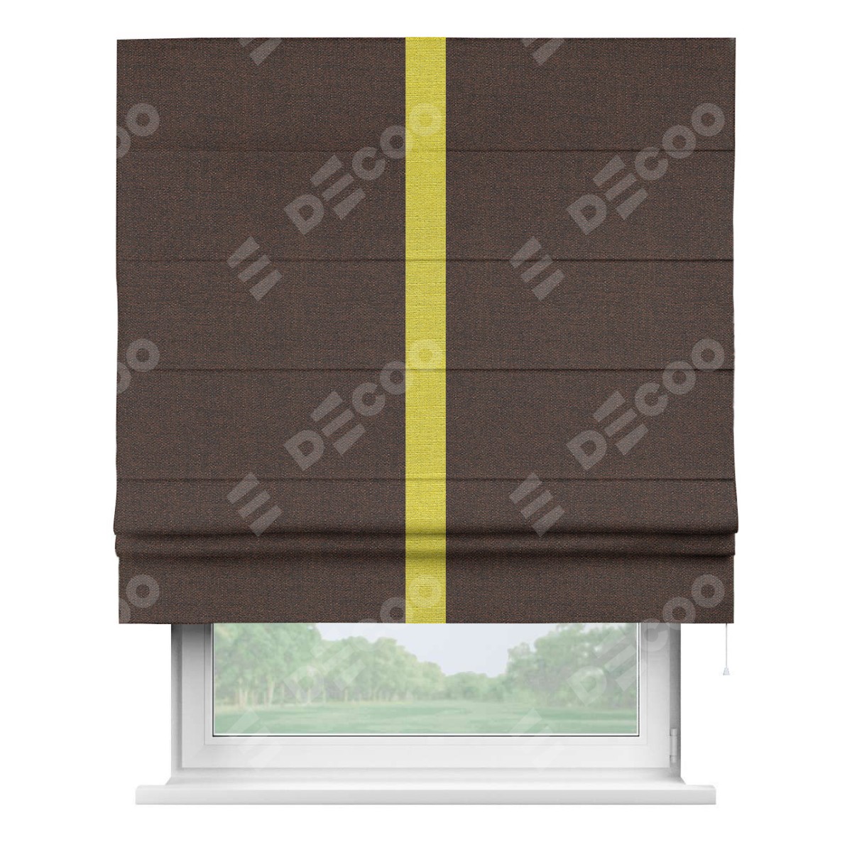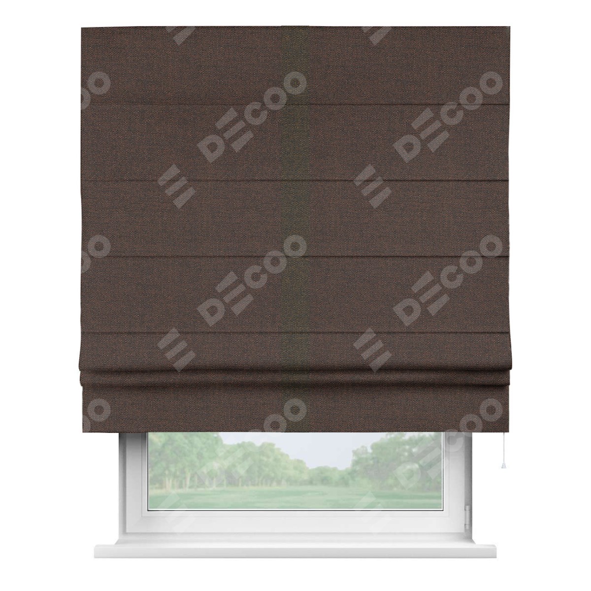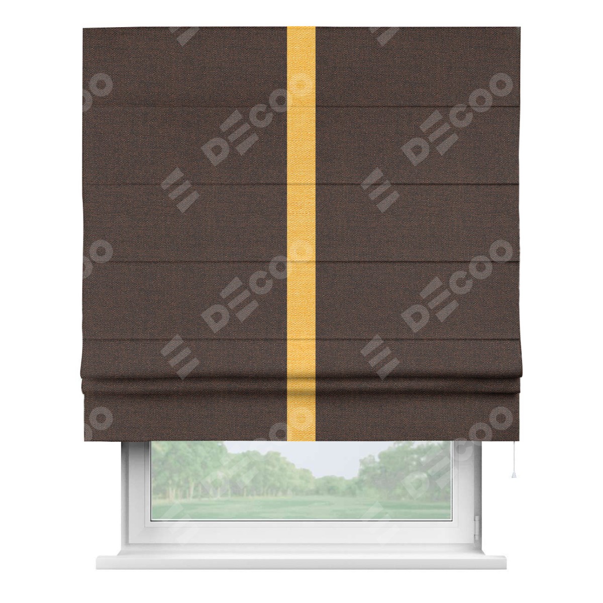 Римская штора производителя «Cortin», используется для проёма, пошита из ткани лён коричневый, артикул 53443. Отделка шторы кантом «Хайвэй», ткань для канта используется из льна разной расцветки на выбор. Имеет универсальный механизм и подходит для монтажа: на потолок, на стену и в нишу.