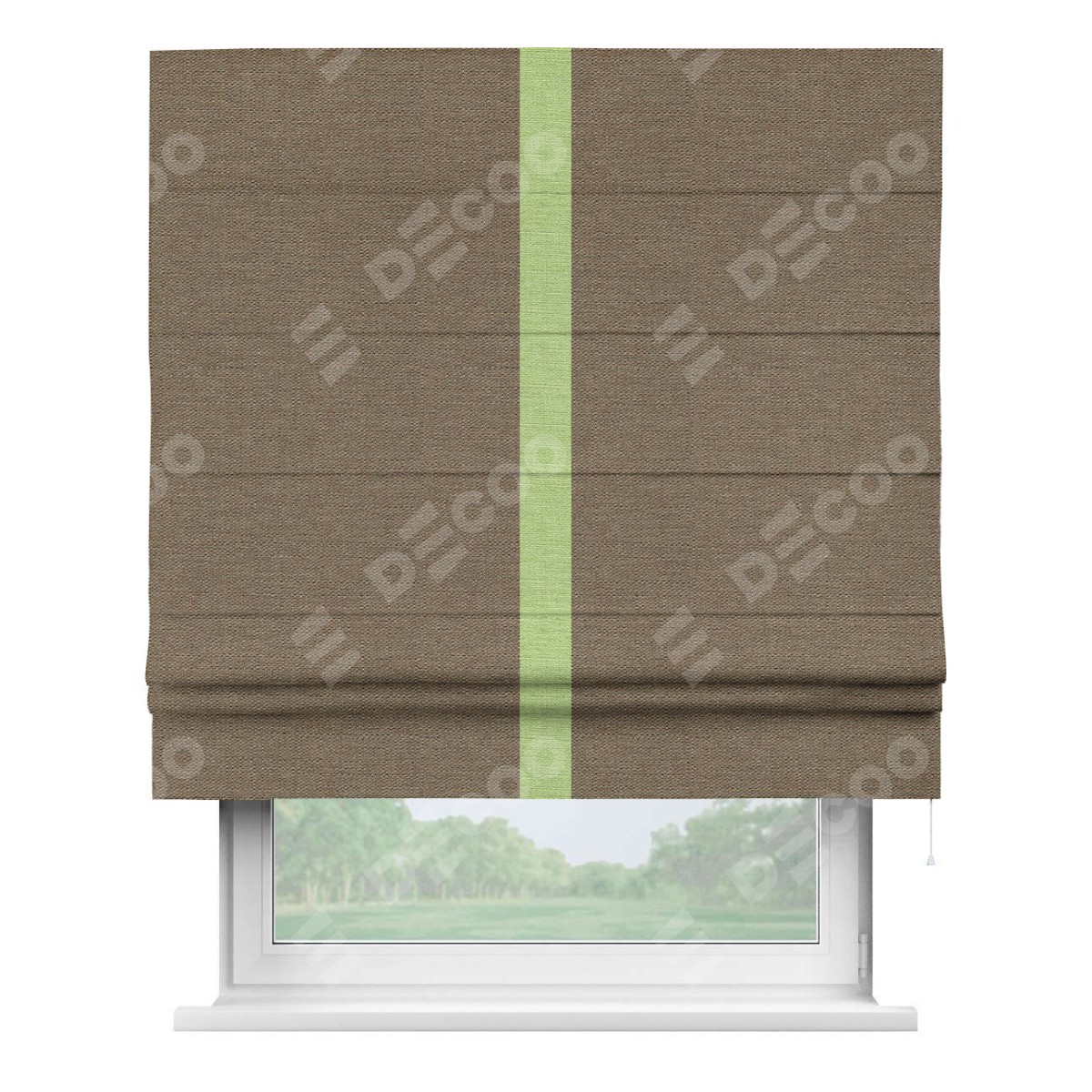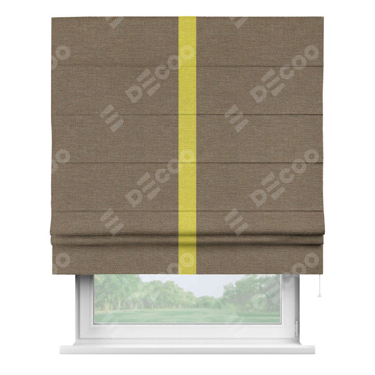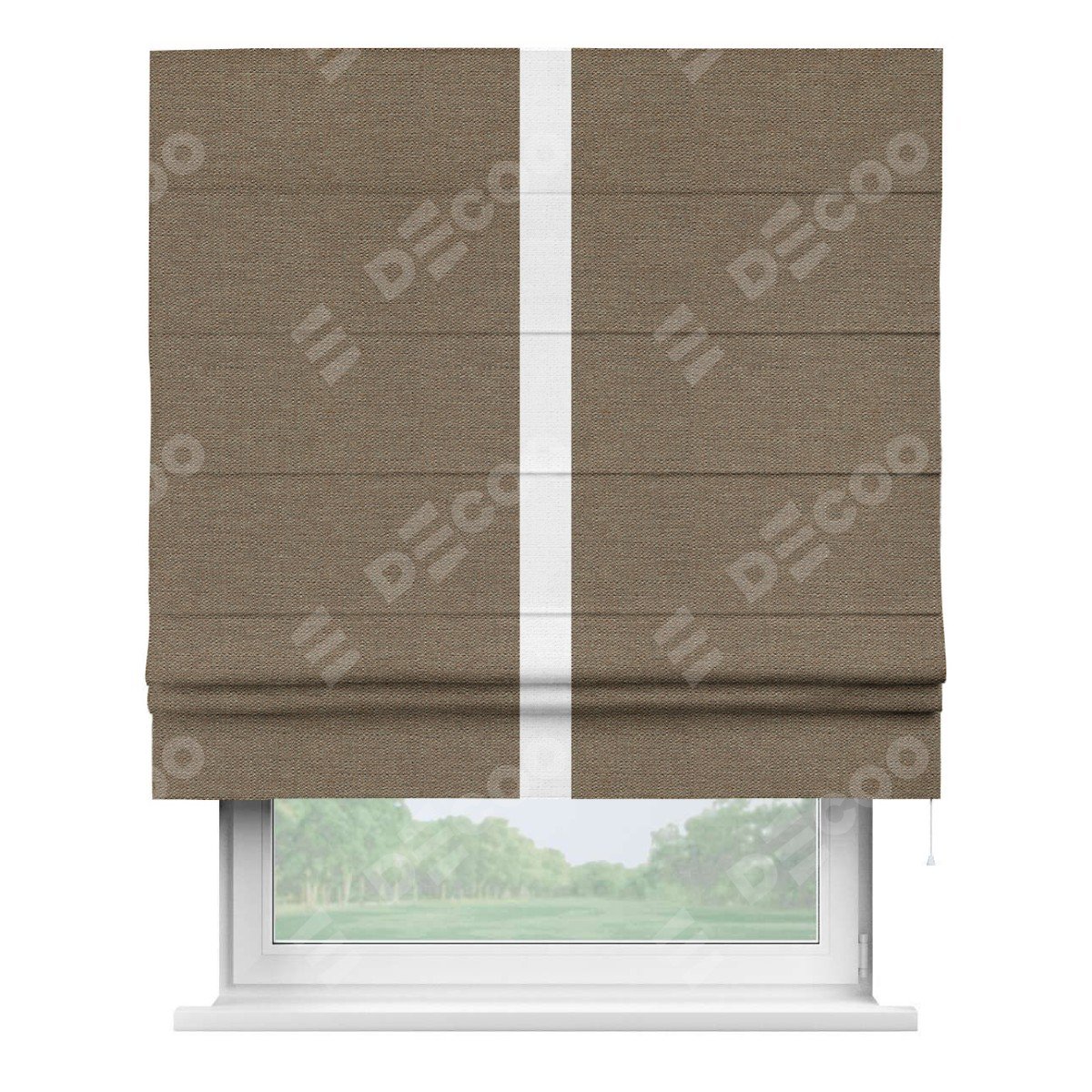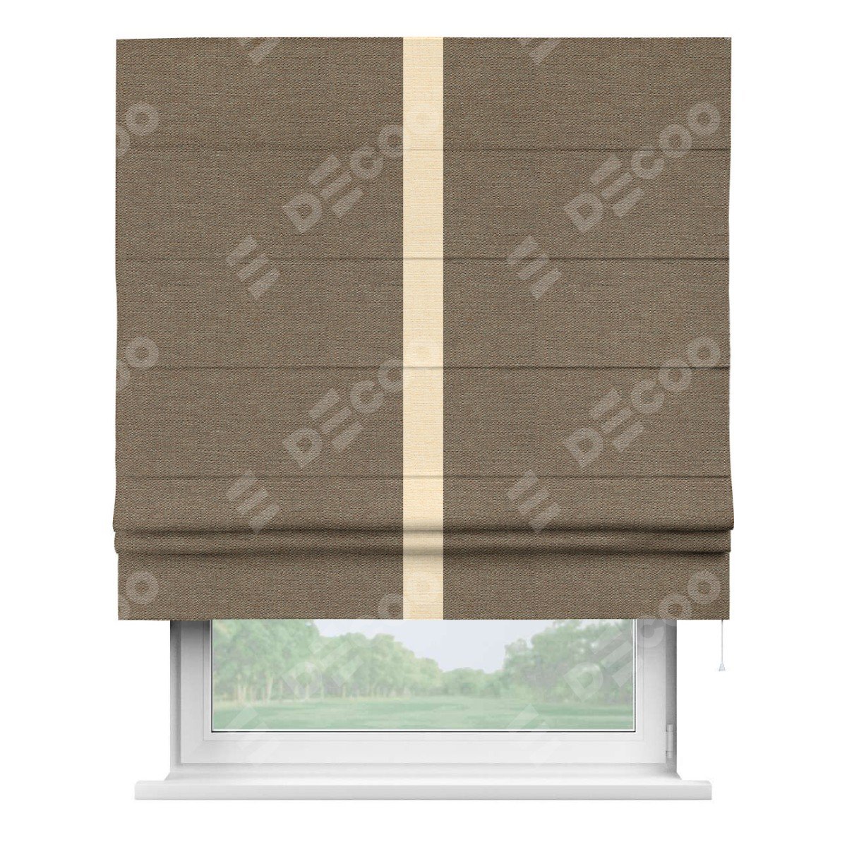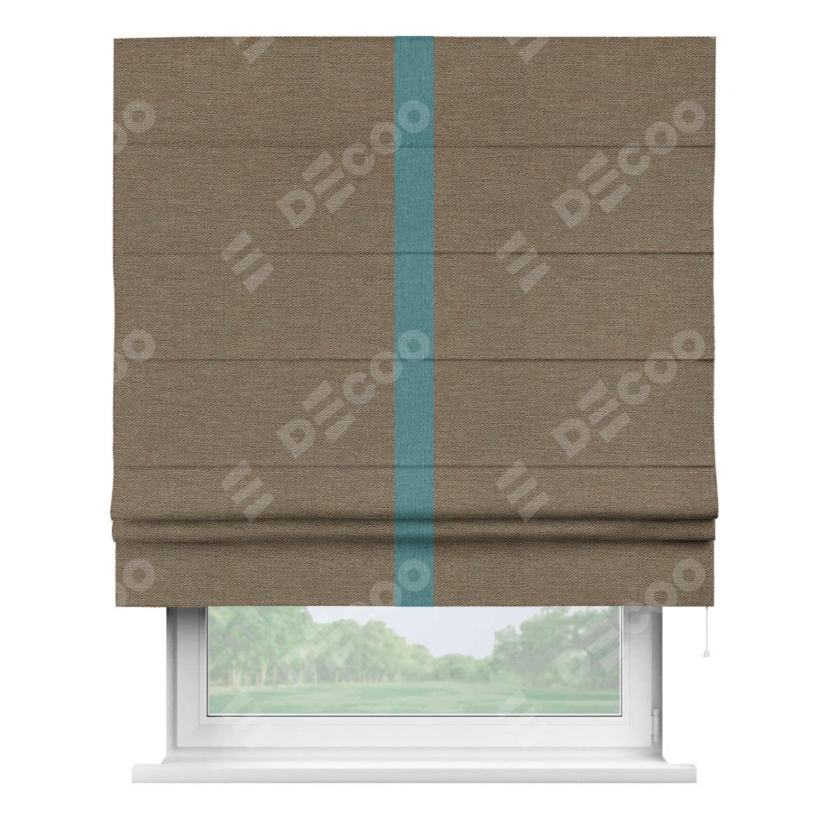 Римская штора производителя «Cortin», используется для проёма, пошита из ткани лён светло-коричневый, артикул 53434. Отделка шторы кантом «Хайвэй», ткань для канта используется из льна разной расцветки на выбор. Имеет универсальный механизм и подходит для монтажа: на потолок, на стену и в нишу.