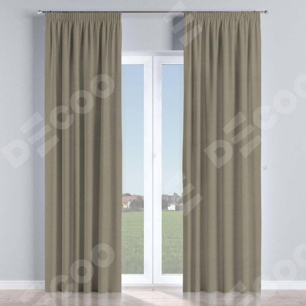 Комплект прямых штор, от производителя «Cortin», пошиты из ткани блэкаут однотонный бежево-серый, артикул ткани 00004. С изнаночной стороны в верхней части штор пристрачивается шторная лента с декоративными складками «Карандаш». Для создания элегантных складок прямые шторы шьются по стандарту с коэффициентом 1:2 (на 100 см. ширины проёма 200 см. ширины ткани).