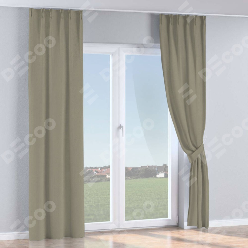 Комплект прямых штор, от производителя «Cortin», пошиты из ткани блэкаут однотонный серо-зелёный, артикул ткани 29568. С изнаночной стороны в верхней части штор пристрачивается шторная лента с декоративными складками «Кустик». Для создания элегантных складок прямые шторы шьются по стандарту с коэффициентом 1:2 (на 100 см. ширины проёма 200 см. ширины ткани).
