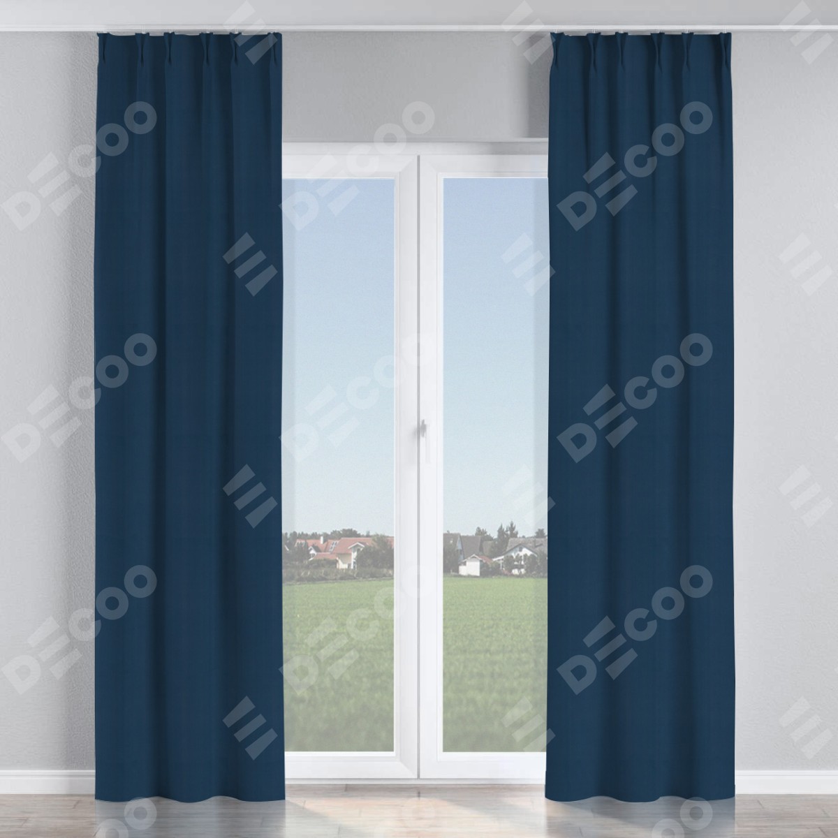 Комплект прямых штор, от производителя «Cortin», пошиты из ткани блэкаут однотонный синий, артикул ткани 29327. С изнаночной стороны в верхней части штор пристрачивается шторная лента с декоративными складками «Кустик». Для создания элегантных складок прямые шторы шьются по стандарту с коэффициентом 1:2 (на 100 см. ширины проёма 200 см. ширины ткани).