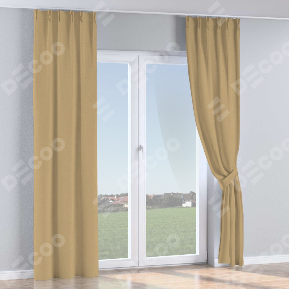Комплект прямых штор, от производителя «Cortin», пошиты из ткани лён димаут тёмно-бежевый, артикул ткани 83037. С изнаночной стороны в верхней части штор пристрачивается шторная лента с декоративными складками «Кустик». Для создания элегантных складок прямые шторы шьются по стандарту с коэффициентом 1:2 (на 100 см. ширины проёма 200 см. ширины ткани).