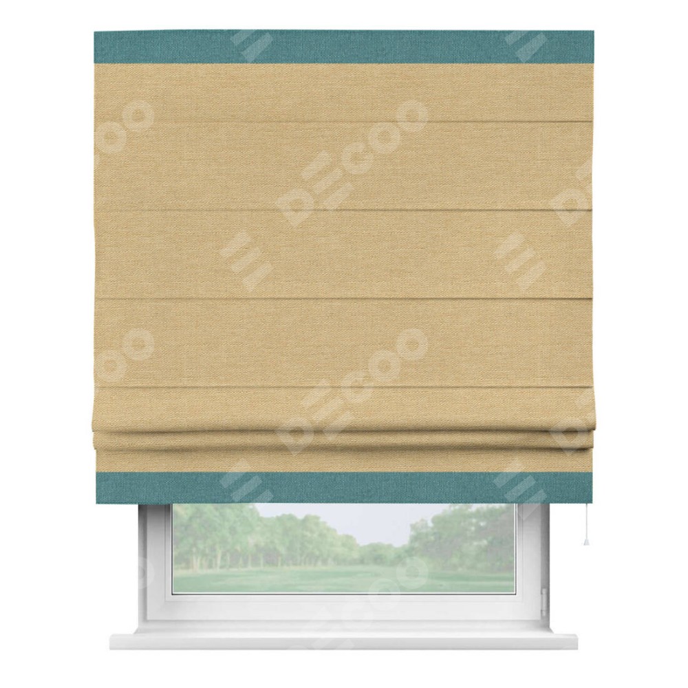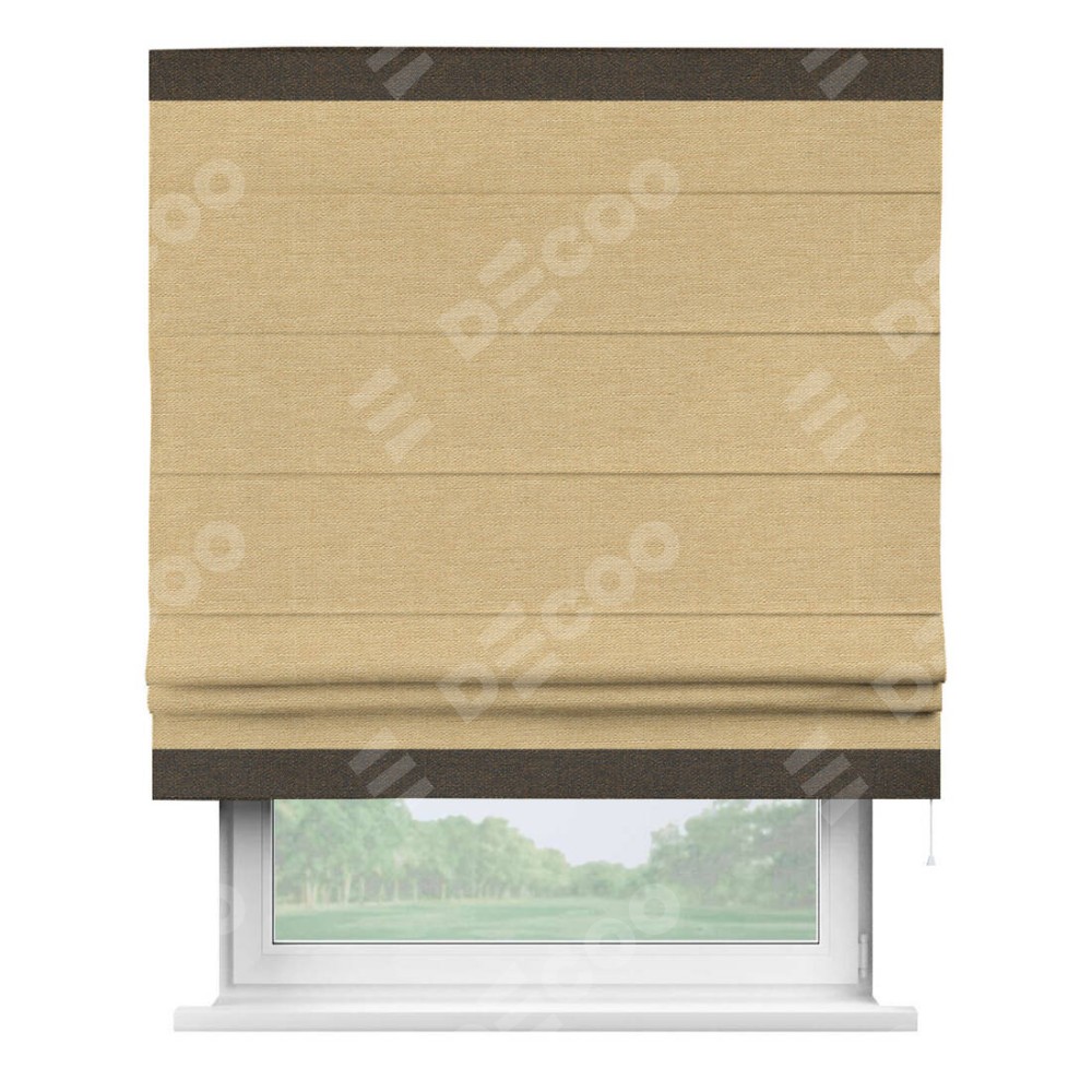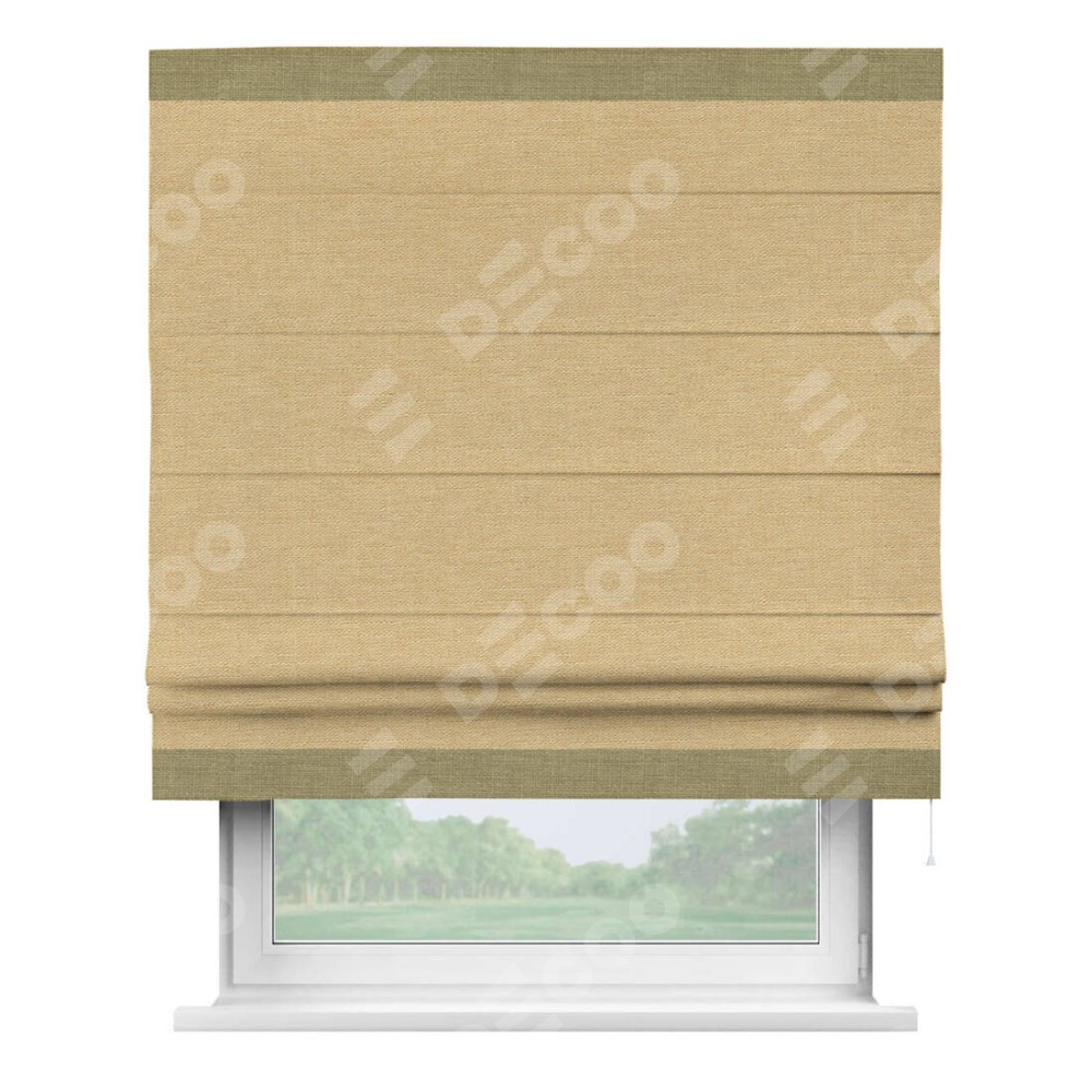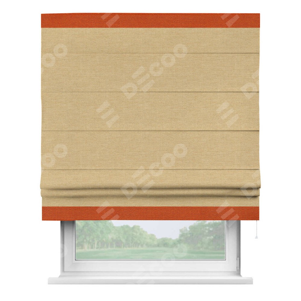Римская штора производителя «Cortin», используется для проёма, пошита из ткани лён темно-бежевый, артикул 53433. Отделка шторы кантом «Горизонт», ткань для канта используется из льна разной расцветки на выбор. Имеет универсальный механизм и подходит для монтажа: на потолок, на стену и в нишу.