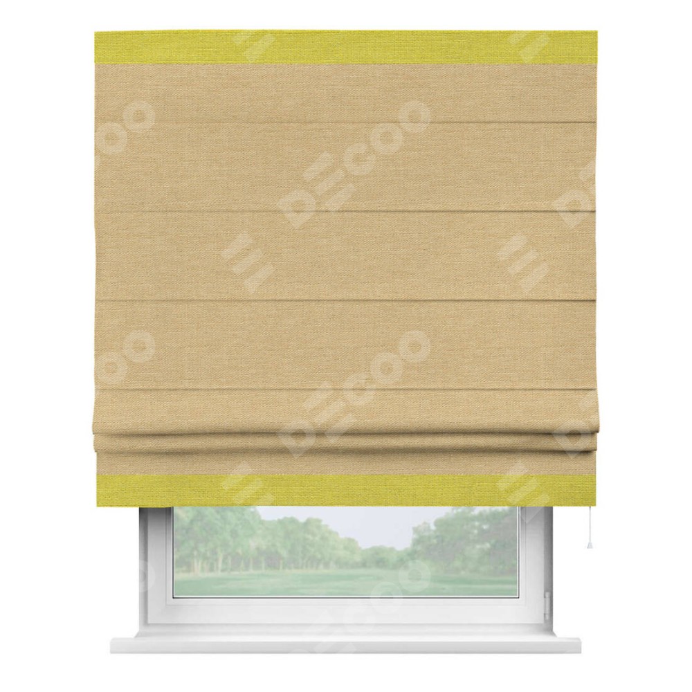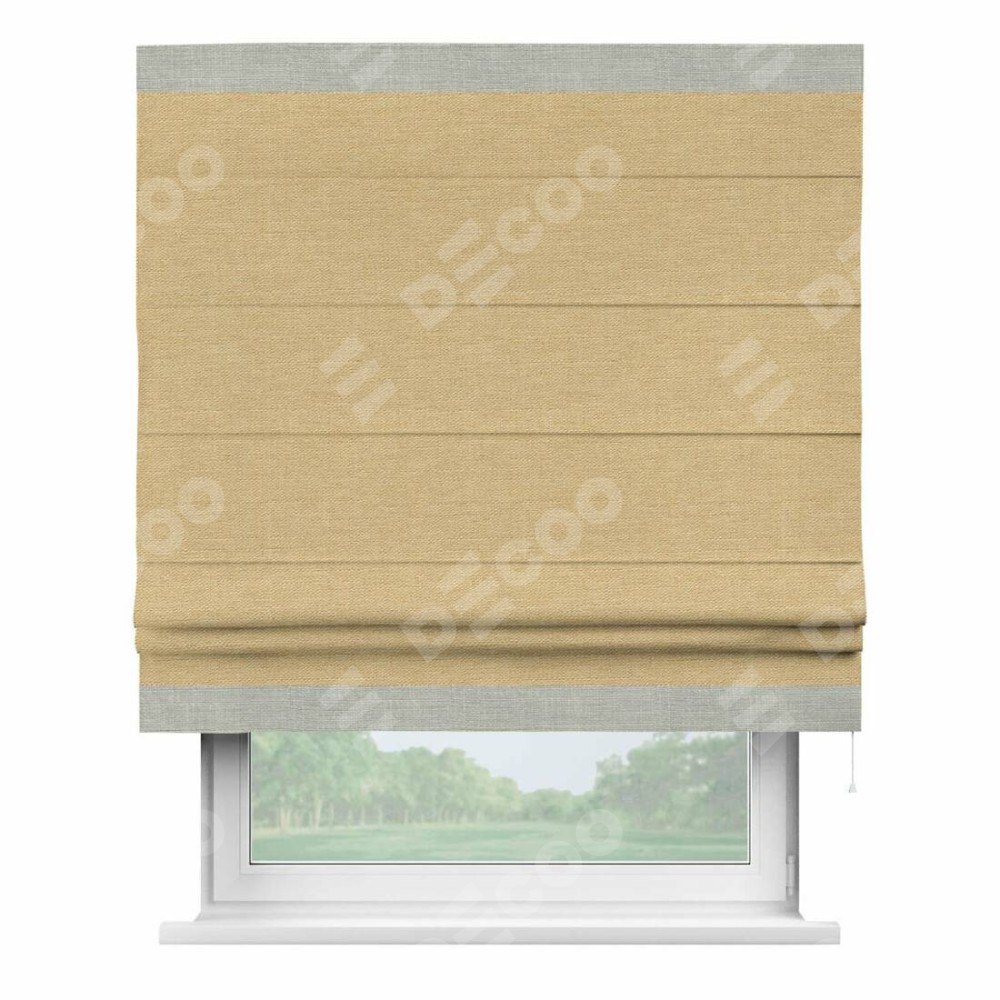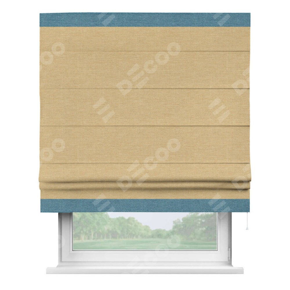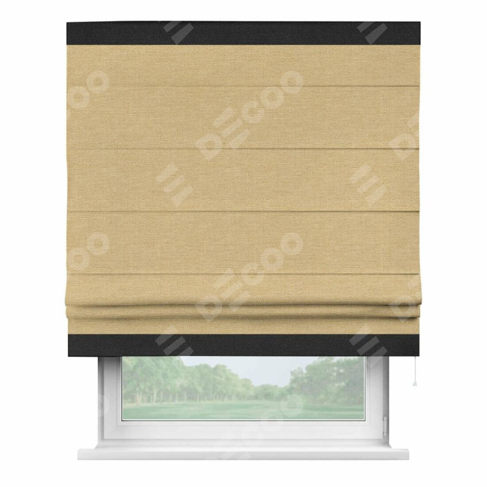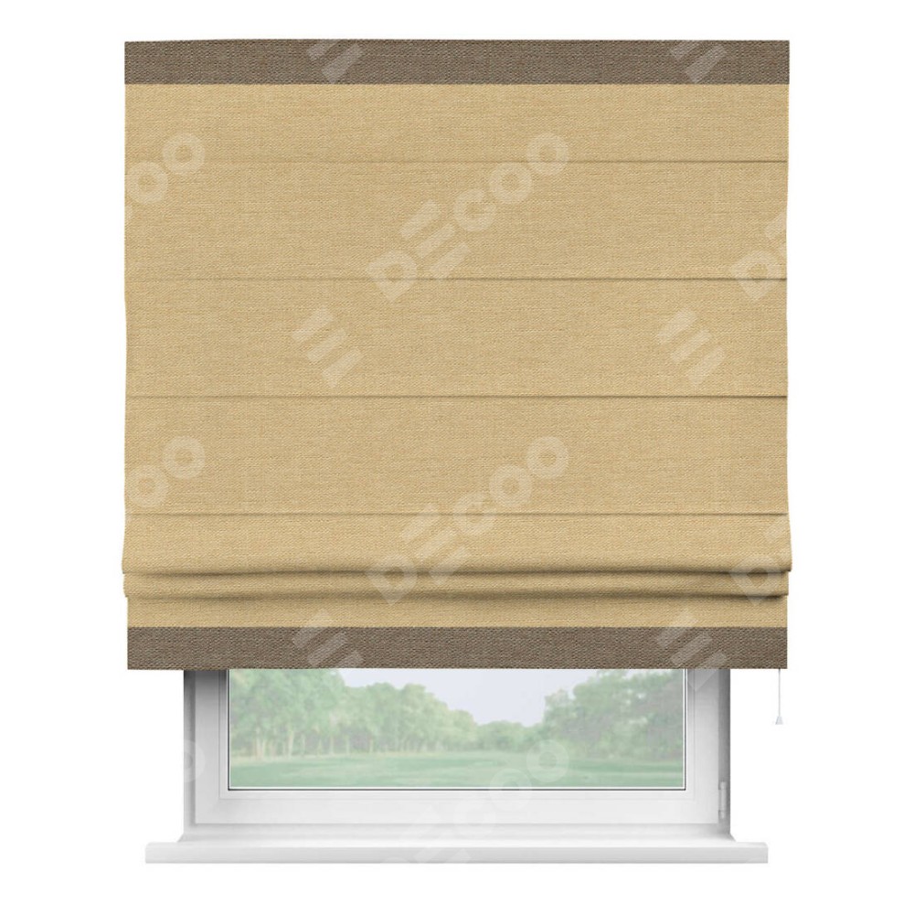 Римская штора производителя «Cortin», используется для проёма, пошита из ткани лён темно-бежевый, артикул 53433. Отделка шторы кантом «Горизонт», ткань для канта используется из льна разной расцветки на выбор. Имеет универсальный механизм и подходит для монтажа: на потолок, на стену и в нишу.