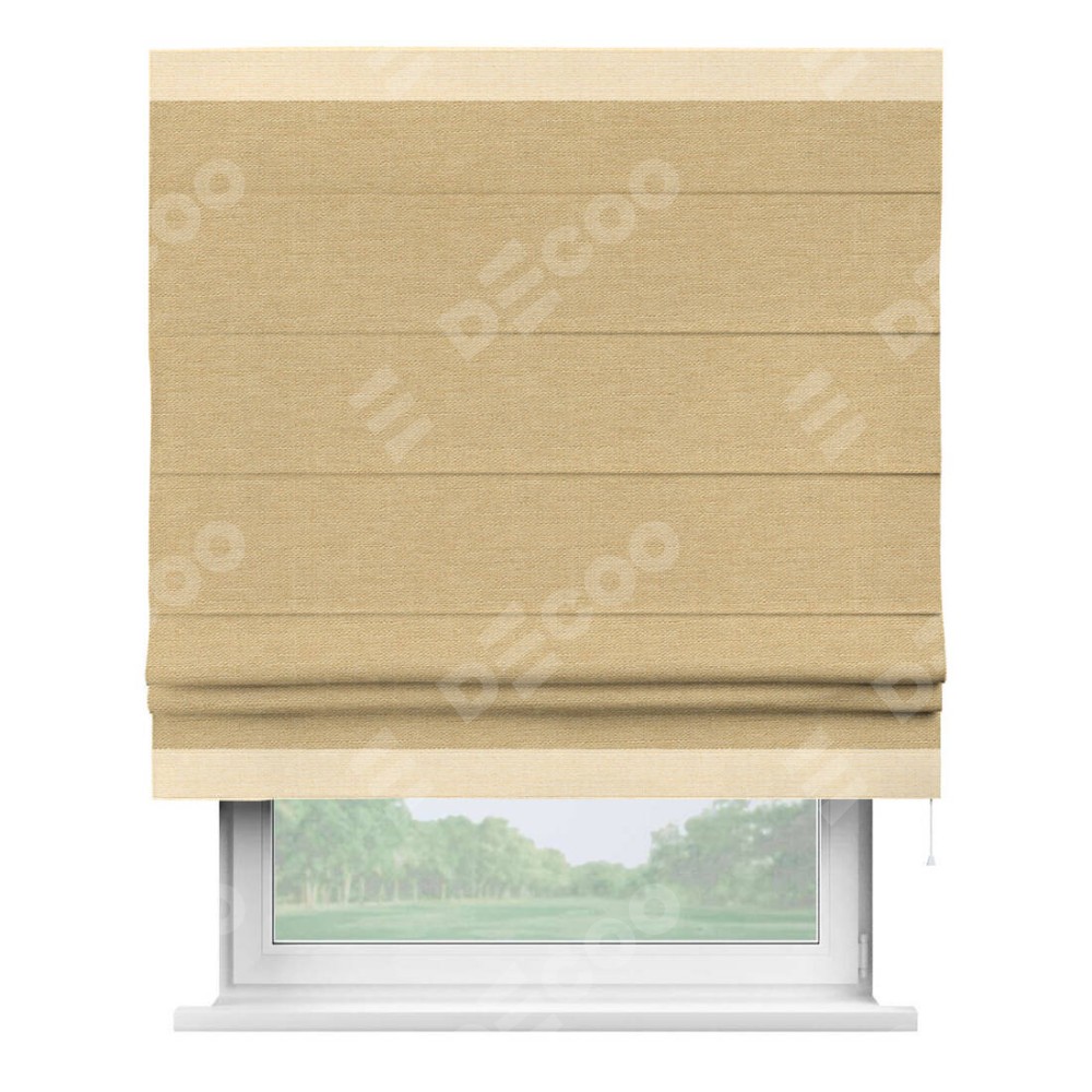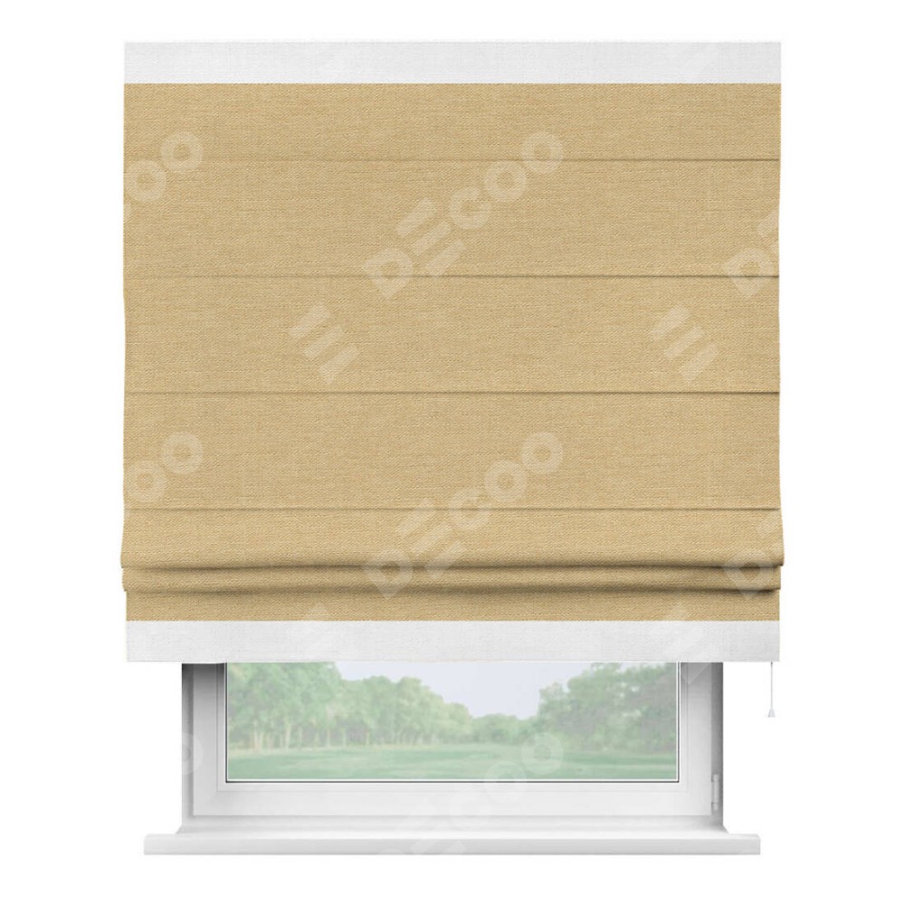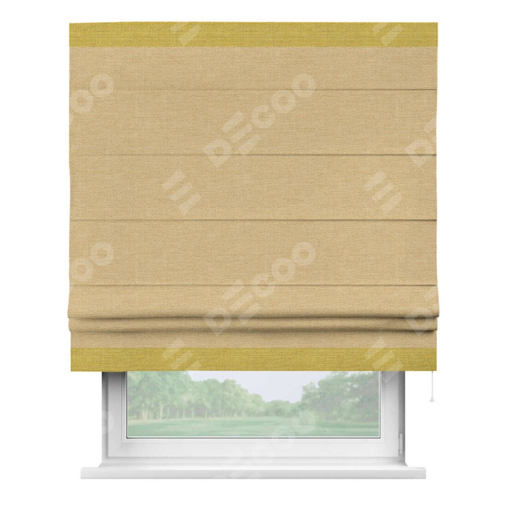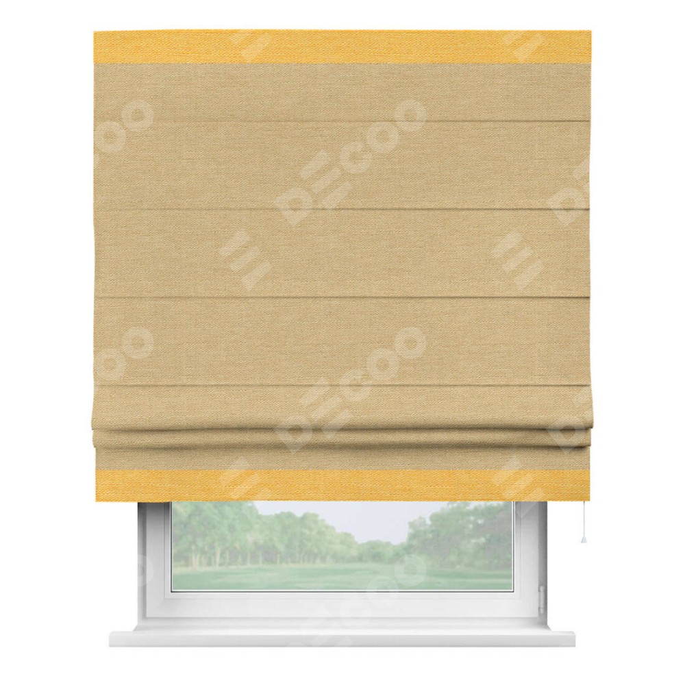 Римская штора производителя «Cortin», используется для проёма, пошита из ткани лён темно-бежевый, артикул 53433. Отделка шторы кантом «Горизонт», ткань для канта используется из льна разной расцветки на выбор. Имеет универсальный механизм и подходит для монтажа: на потолок, на стену и в нишу.
