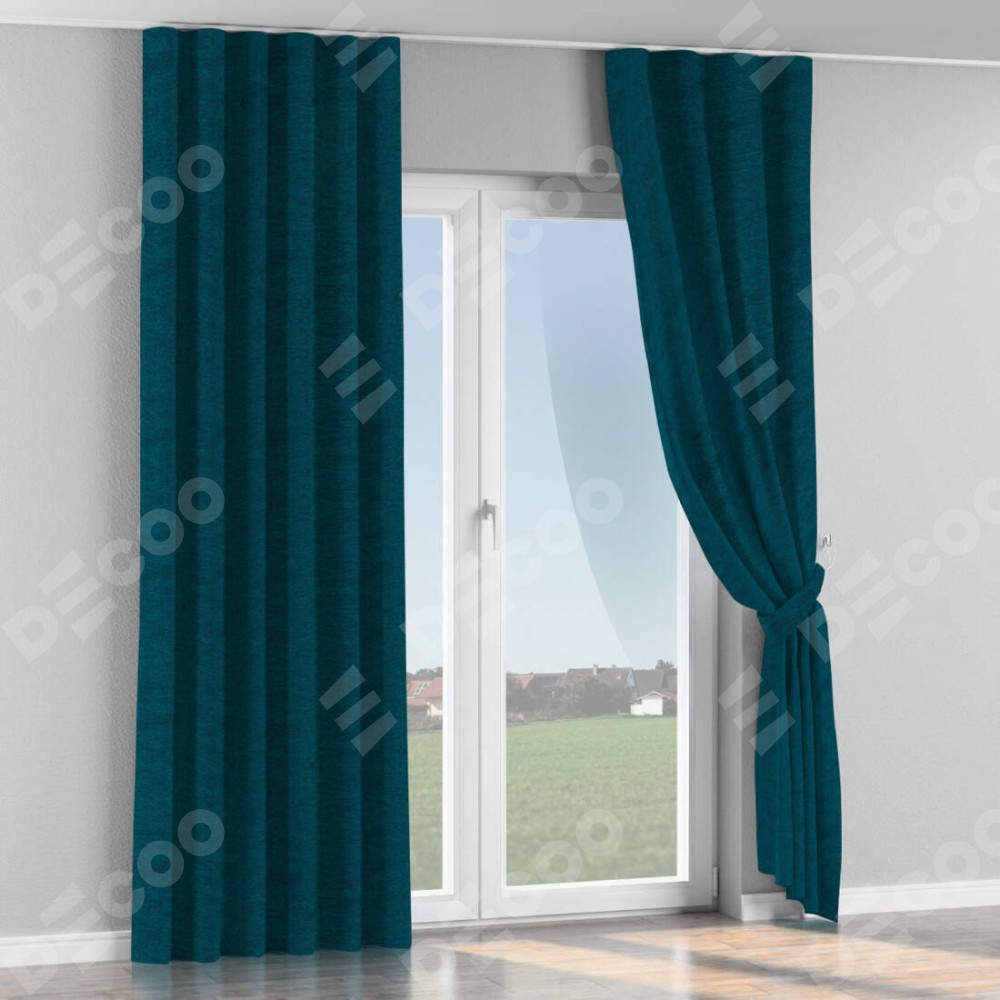 Комплект прямых штор, от производителя «Cortin», пошиты из ткани твид блэкаут глубокий синий, артикул ткани 21590. С изнаночной стороны в верхней части штор пристрачивается шторная лента с декоративными складками «Волна». Для создания элегантных складок прямые шторы шьются по стандарту с коэффициентом 1:2 (на 100 см. ширины проёма 200 см. ширины ткани).