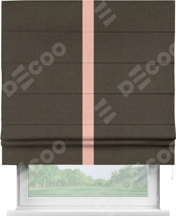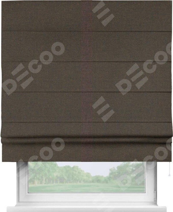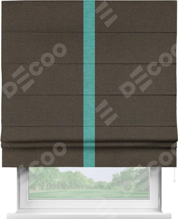Римская штора производителя «Cortin», используется для проёма, пошита из ткани лён темно-коричневый, артикул 53444. Отделка шторы кантом «Хайвэй», ткань для канта используется из льна разной расцветки на выбор. Имеет универсальный механизм и подходит для монтажа: на потолок, на стену и в нишу.