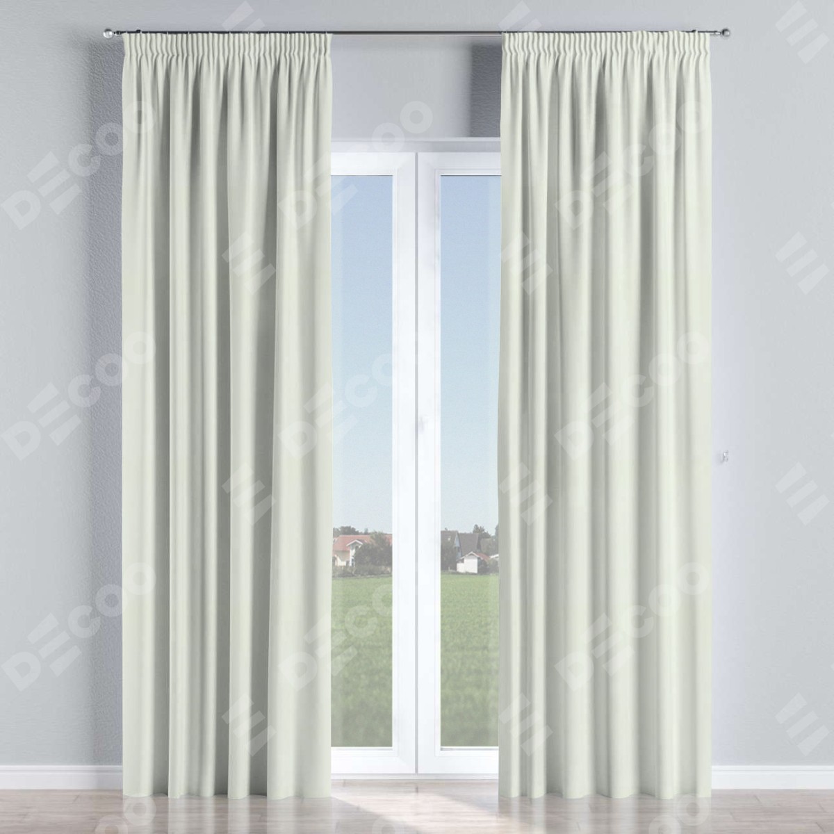 Комплект прямых штор, от производителя «Cortin», пошиты из ткани вельвет кремовый, артикул ткани 85524. С изнаночной стороны в верхней части штор пристрачивается шторная лента с декоративными складками «Карандаш». Для создания элегантных складок прямые шторы шьются по стандарту с коэффициентом 1:2 (на 100 см. ширины проёма 200 см. ширины ткани).