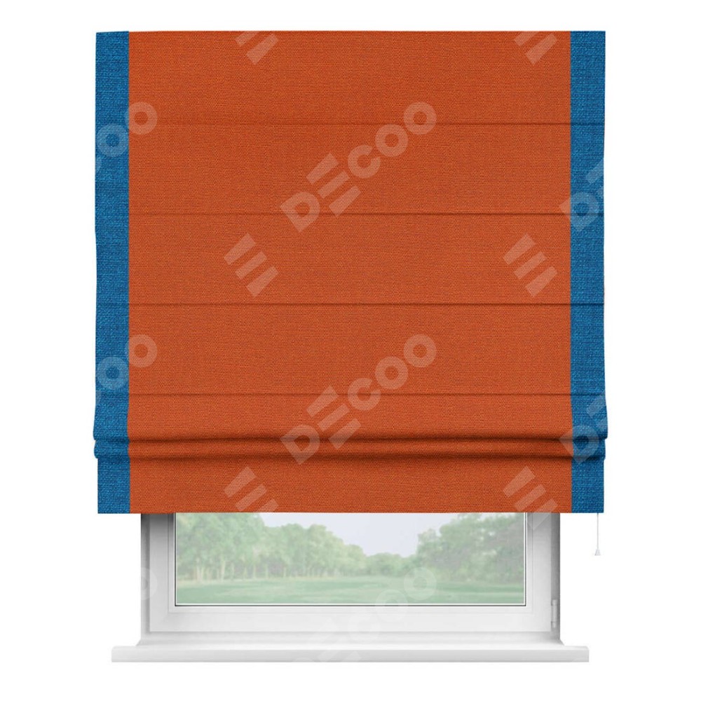 Римская штора производителя «Cortin», используется для проёма, пошита из ткани лён терракотовый, артикул 53440. Отделка шторы кантом «Стрим Дуо», ткань для канта используется из льна разной расцветки на выбор. Имеет универсальный механизм и подходит для монтажа: на потолок, на стену и в нишу.