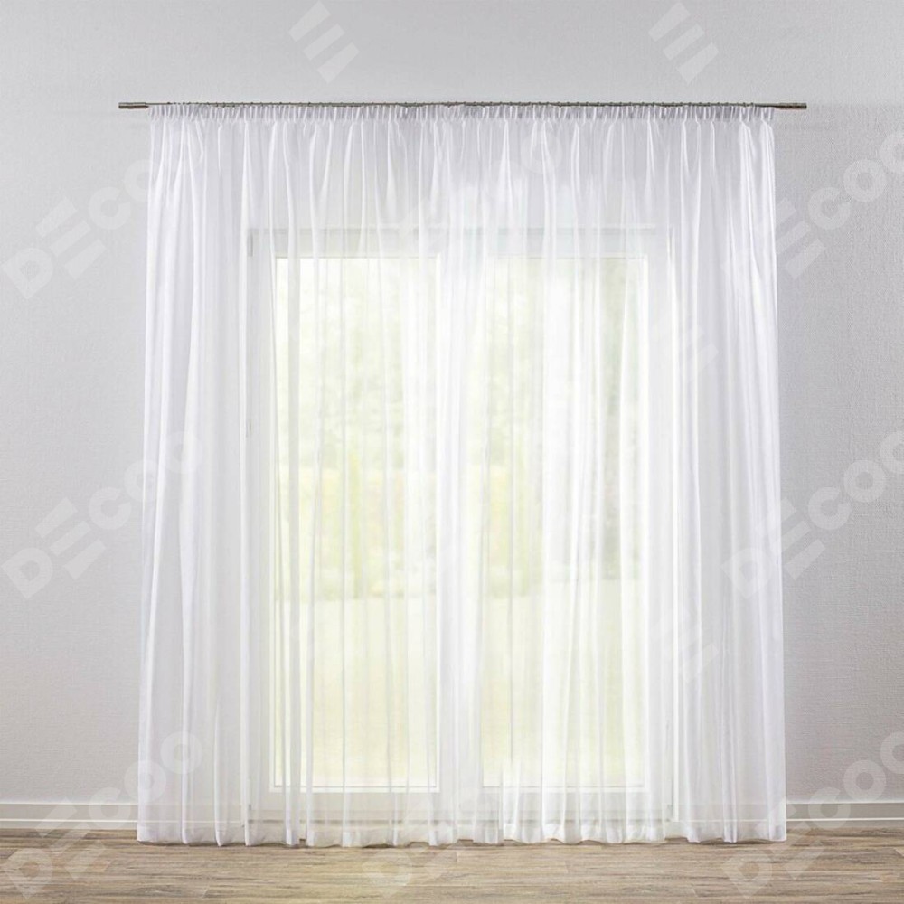 Комплект прямых штор, от производителя «Cortin», пошиты из ткани тюль белый, артикул ткани V-01. С изнаночной стороны в верхней части штор пристрачивается шторная лента с декоративными складками «Карандаш». Для создания элегантных складок прямые шторы шьются по стандарту с коэффициентом 1:2 (на 100 см. ширины проёма 200 см. ширины ткани).