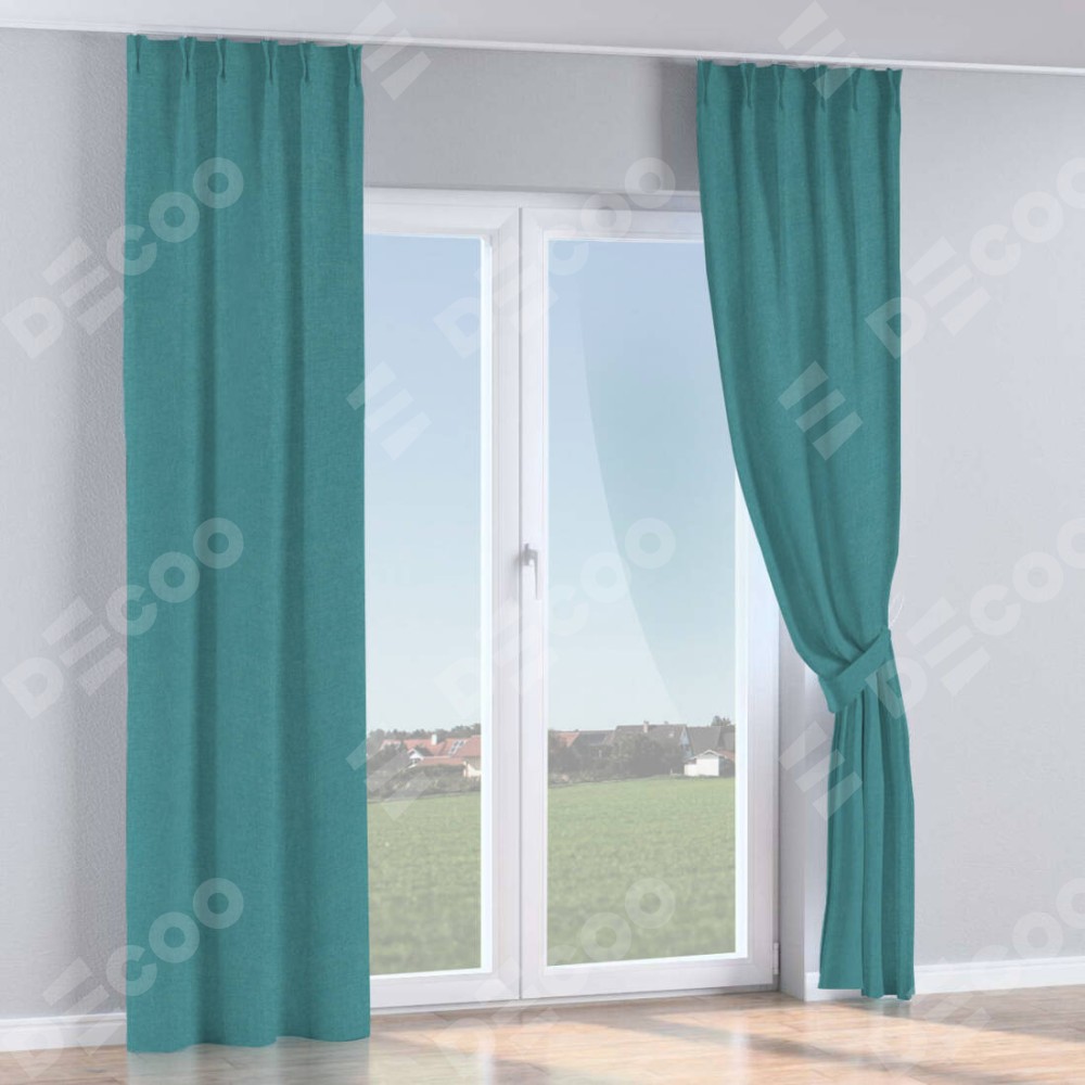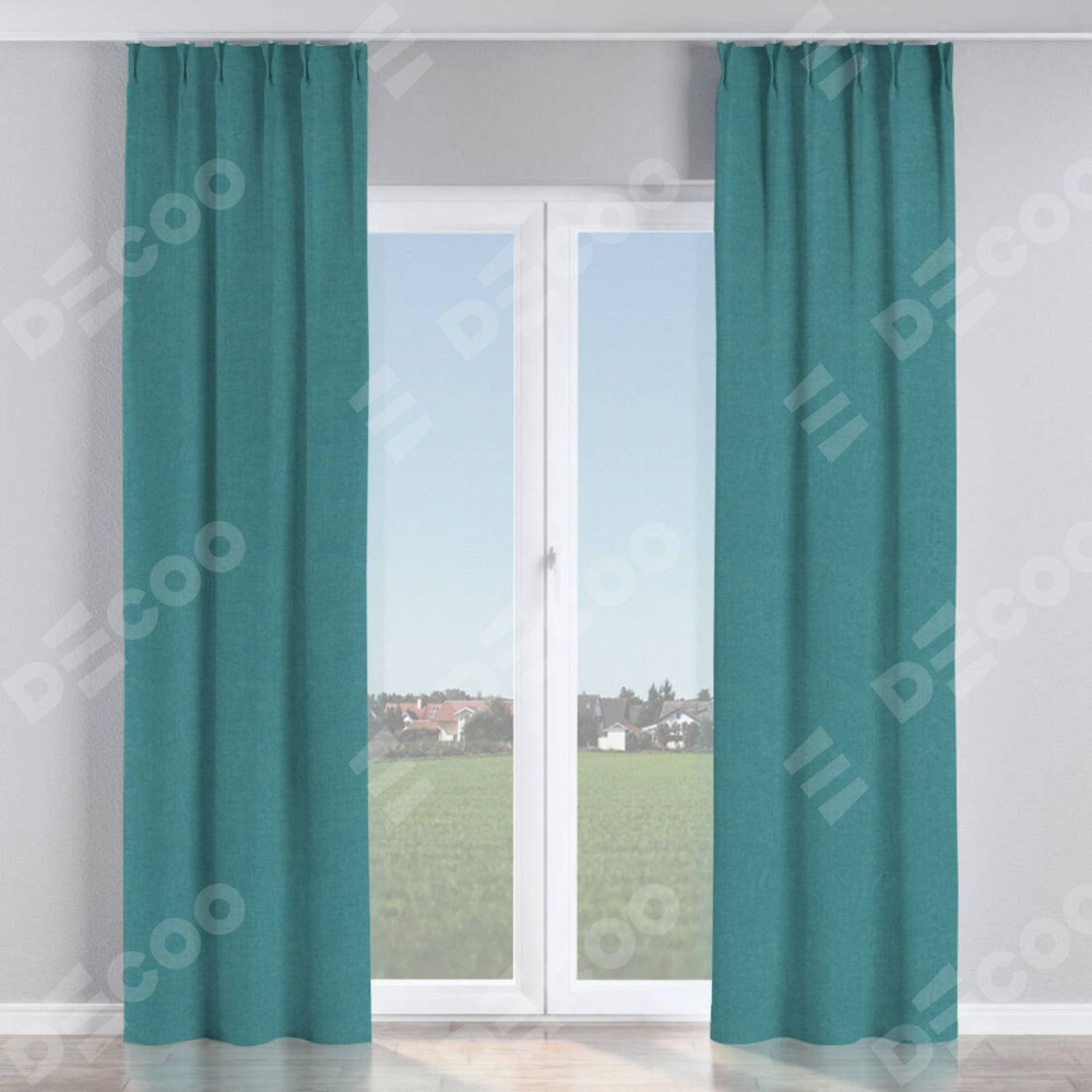 Комплект прямых штор, от производителя «Cortin», пошиты из ткани лён бирюзовый, артикул ткани 53436. С изнаночной стороны в верхней части штор пристрачивается шторная лента с декоративными складками «Кустик». Для создания элегантных складок прямые шторы шьются по стандарту с коэффициентом 1:2 (на 100 см. ширины проёма 200 см. ширины ткани).