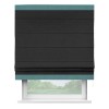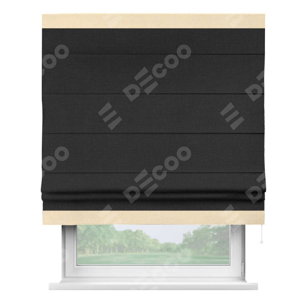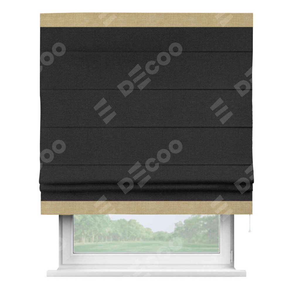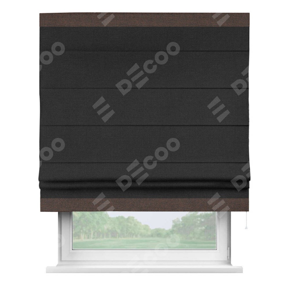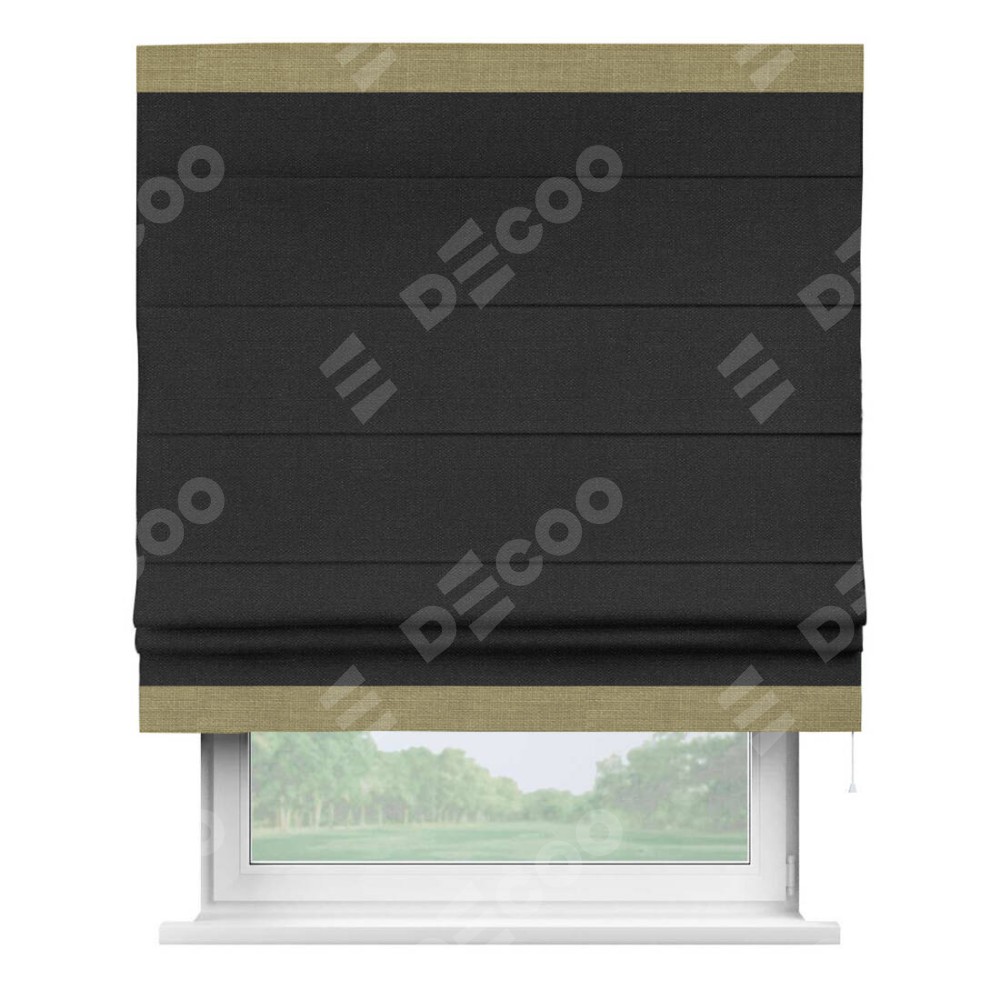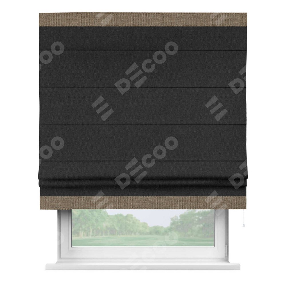 Римская штора производителя «Cortin», используется для проёма, пошита из ткани лён черный, артикул 85927. Отделка шторы кантом «Горизонт», ткань для канта используется из льна разной расцветки на выбор. Имеет универсальный механизм и подходит для монтажа: на потолок, на стену и в нишу.