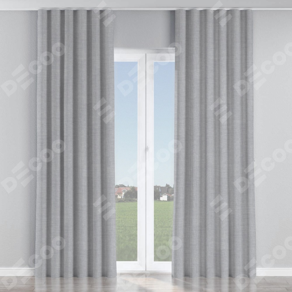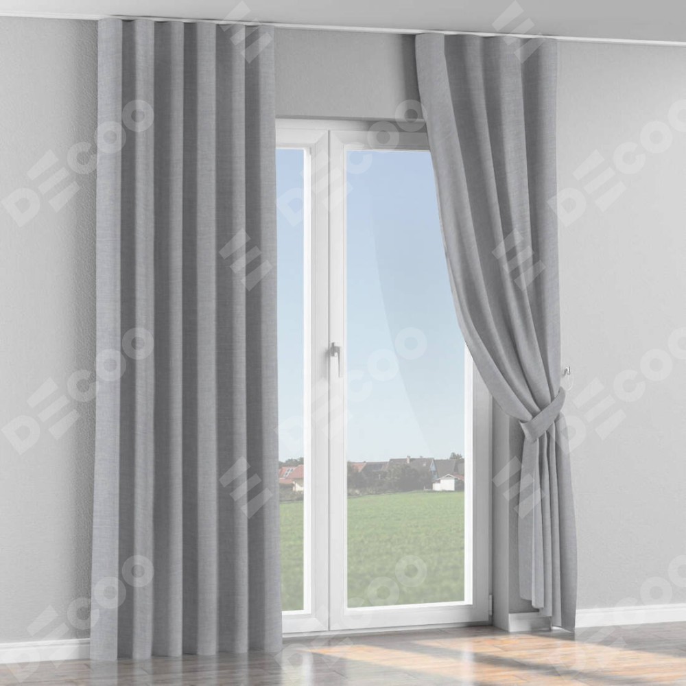 Комплект прямых штор, от производителя «Cortin», пошиты из ткани лён серый, артикул ткани 7440. С изнаночной стороны в верхней части штор пристрачивается шторная лента с декоративными складками «Волна». Для создания элегантных складок прямые шторы шьются по стандарту с коэффициентом 1:2 (на 100 см. ширины проёма 200 см. ширины ткани).