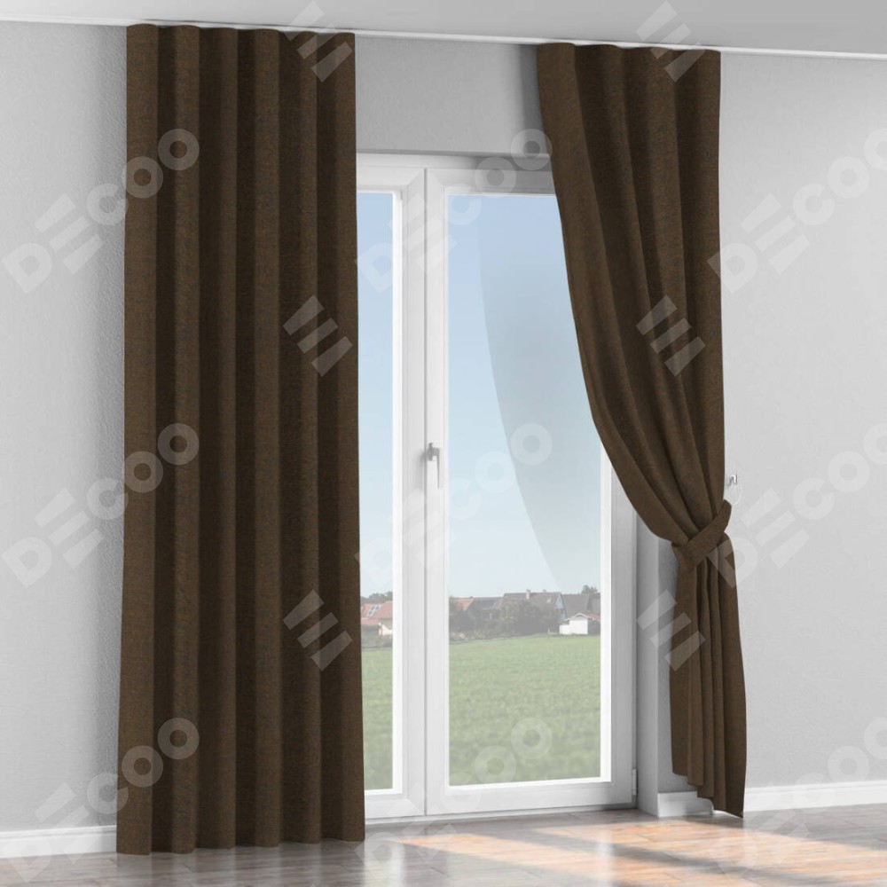 Комплект прямых штор, от производителя «Cortin», пошиты из ткани лён тёмно-коричневый, артикул ткани 53444. С изнаночной стороны в верхней части штор пристрачивается шторная лента с декоративными складками «Волна». Для создания элегантных складок прямые шторы шьются по стандарту с коэффициентом 1:2 (на 100 см. ширины проёма 200 см. ширины ткани).