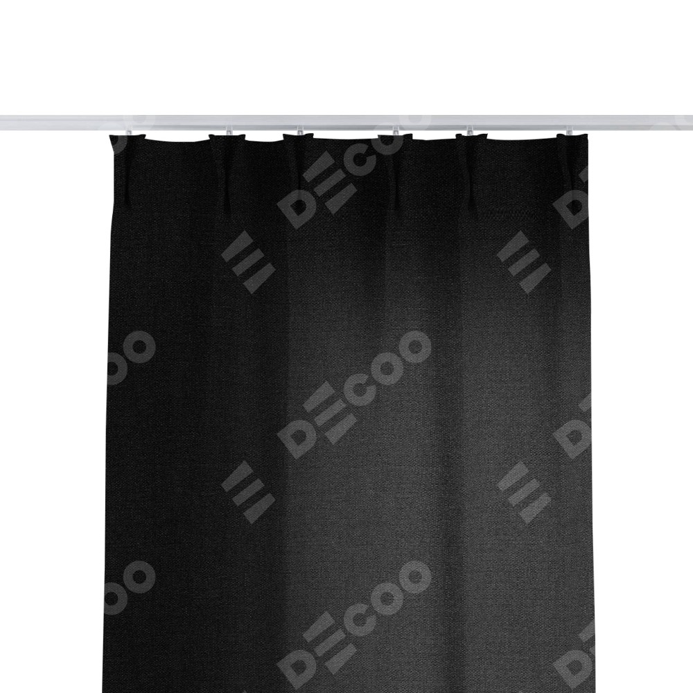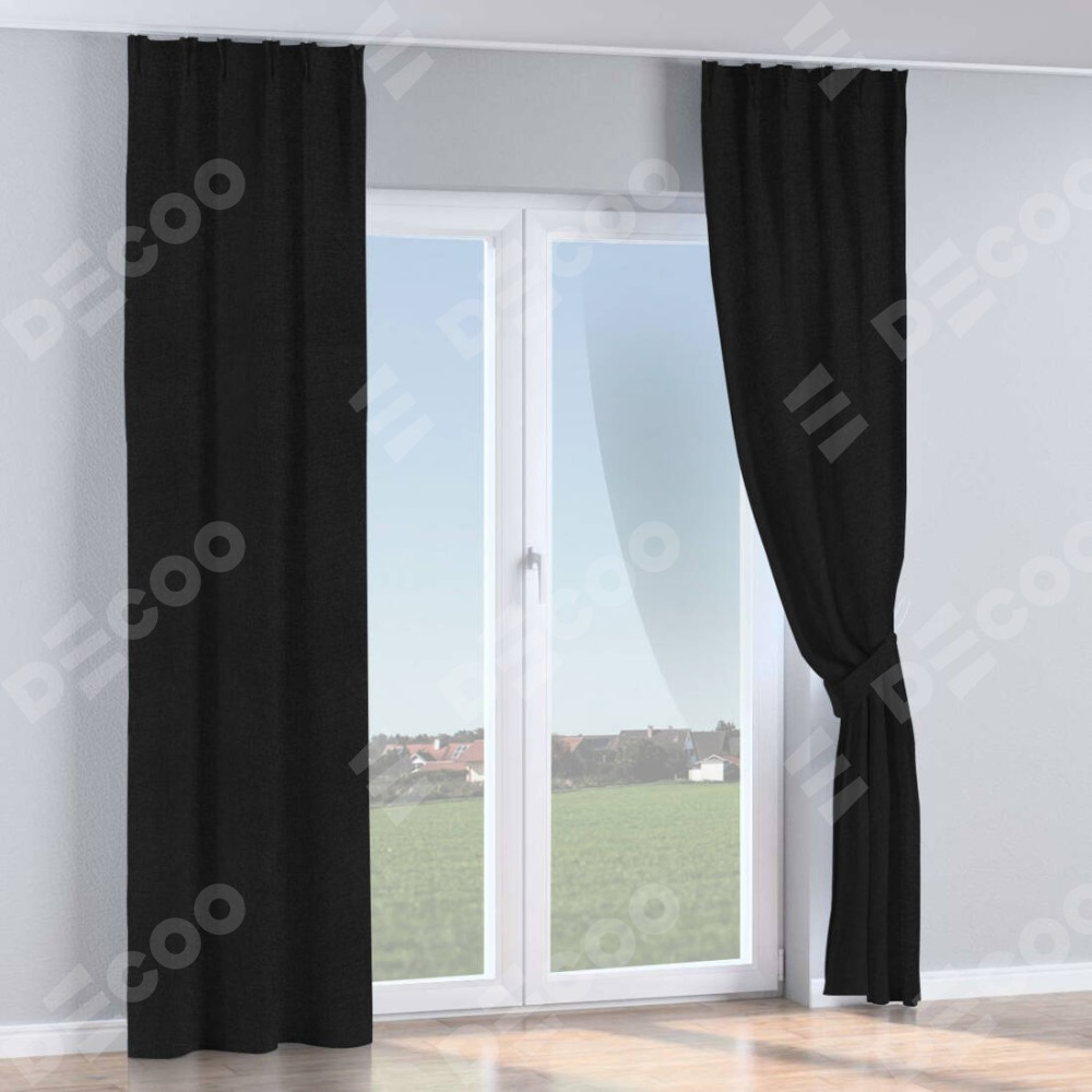 Комплект прямых штор, от производителя «Cortin», пошиты из ткани лён черный, артикул ткани 85927. С изнаночной стороны в верхней части штор пристрачивается шторная лента с декоративными складками «Кустик». Для создания элегантных складок прямые шторы шьются по стандарту с коэффициентом 1:2 (на 100 см. ширины проёма 200 см. ширины ткани).