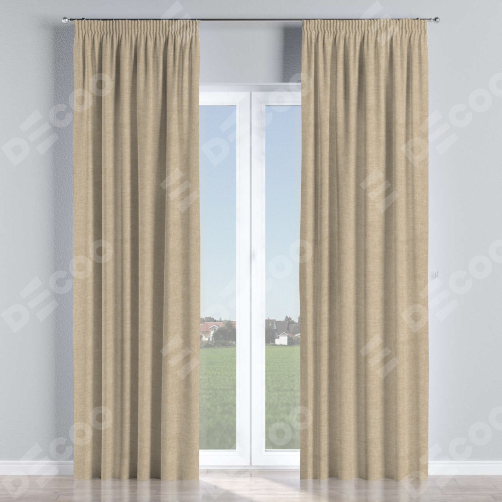 Комплект прямых штор, от производителя «Cortin», пошиты из ткани лён кашемир бежевый, артикул ткани 17206. С изнаночной стороны в верхней части штор пристрачивается шторная лента с декоративными складками «Карандаш». Для создания элегантных складок прямые шторы шьются по стандарту с коэффициентом 1:2 (на 100 см. ширины проёма 200 см. ширины ткани).