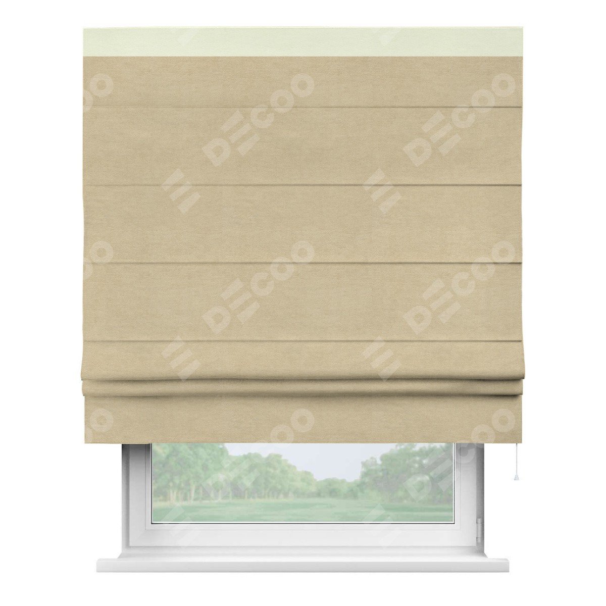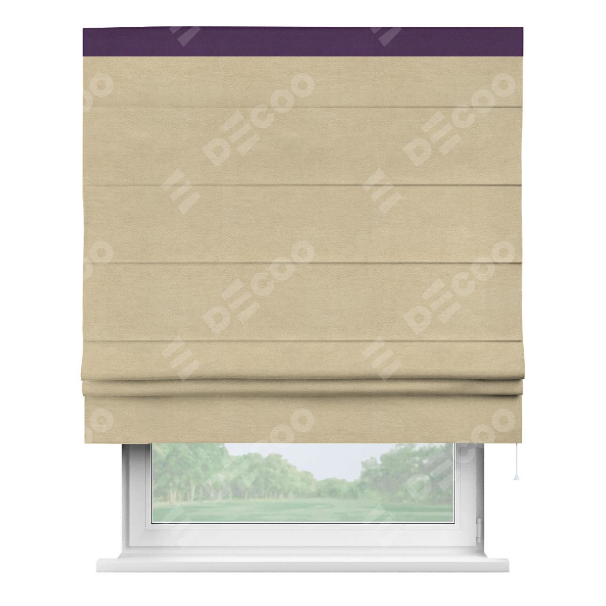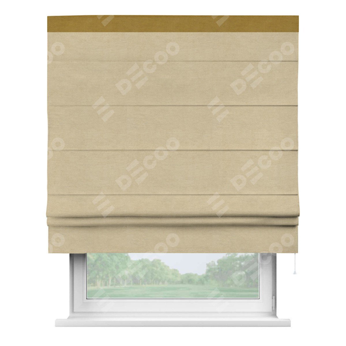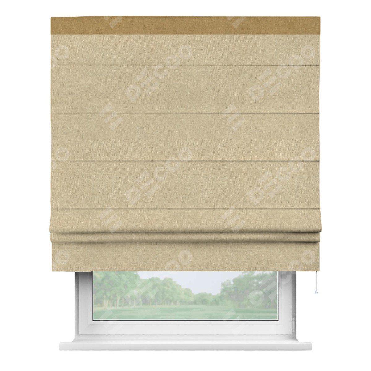 Римская штора производителя «Cortin», используется для проёма, пошита из ткани вельвет бежевый, артикул ткани 85538. Отделка шторы кантом «Кинг», ткань для канта используется из вельвета разной расцветки на выбор. Имеет универсальный механизм и подходит для монтажа: на потолок, на стену и в нишу.