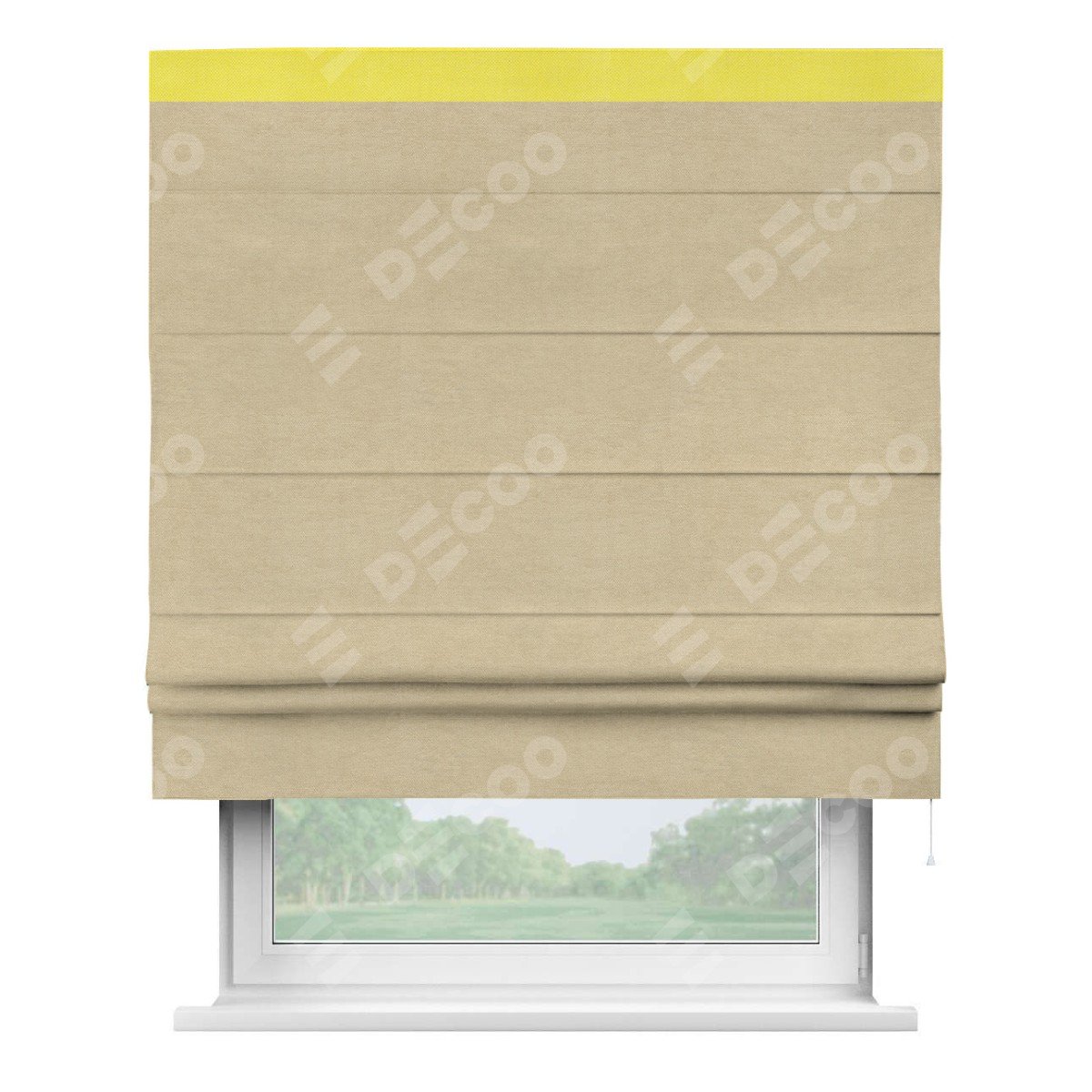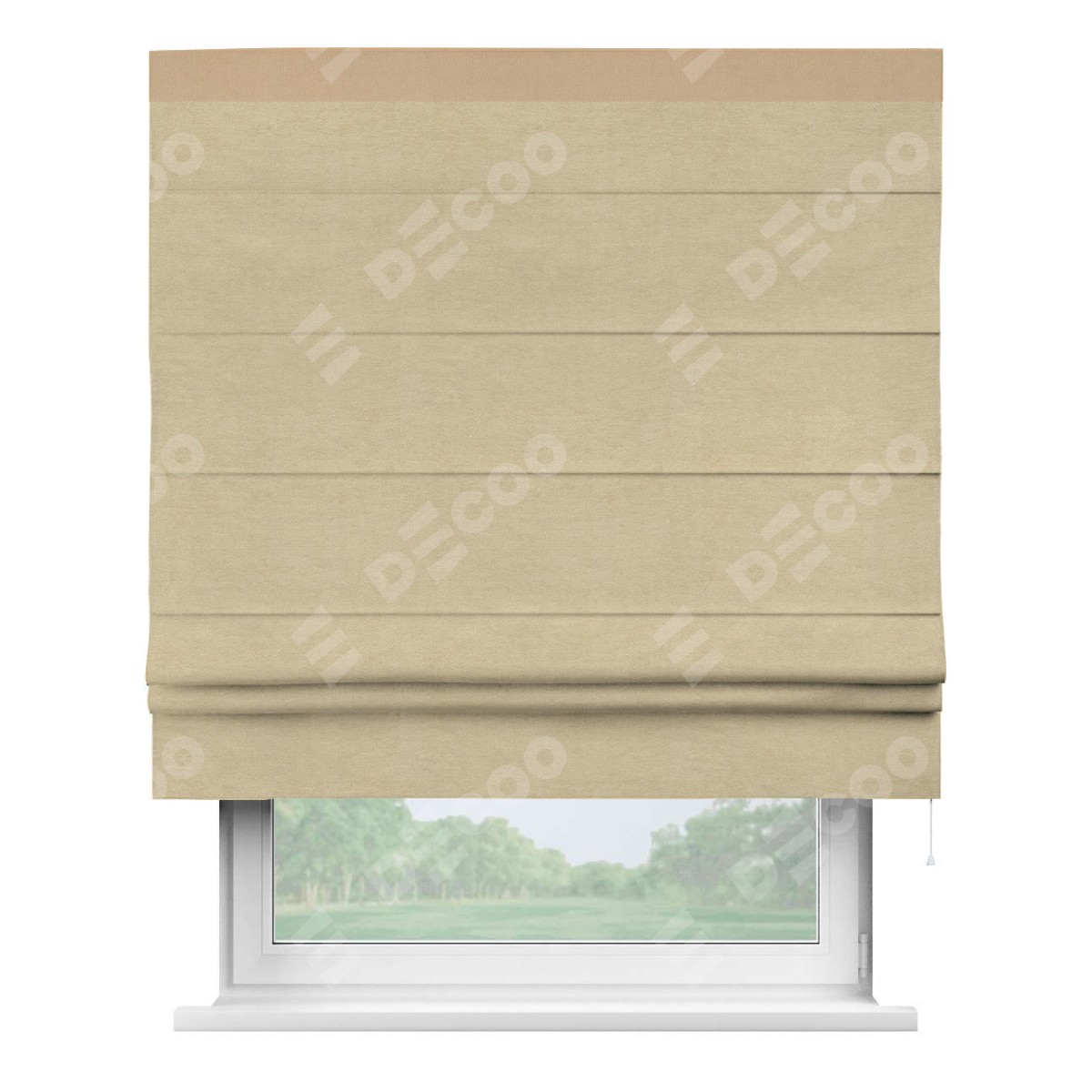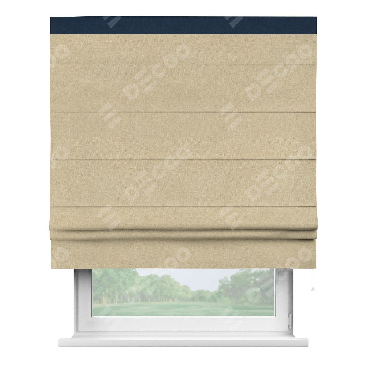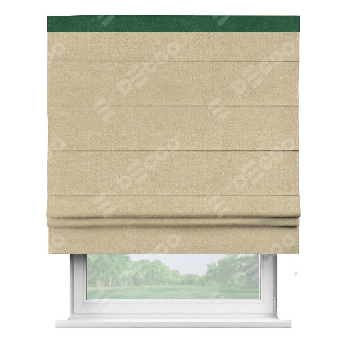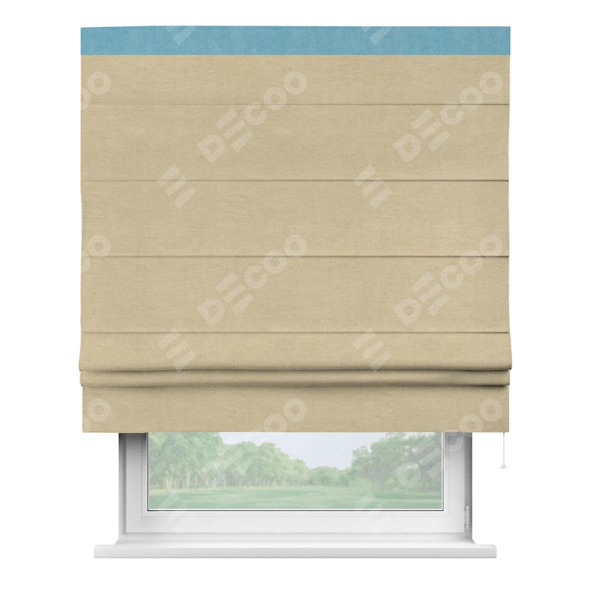 Римская штора производителя «Cortin», используется для проёма, пошита из ткани вельвет бежевый, артикул ткани 85538. Отделка шторы кантом «Кинг», ткань для канта используется из вельвета разной расцветки на выбор. Имеет универсальный механизм и подходит для монтажа: на потолок, на стену и в нишу.