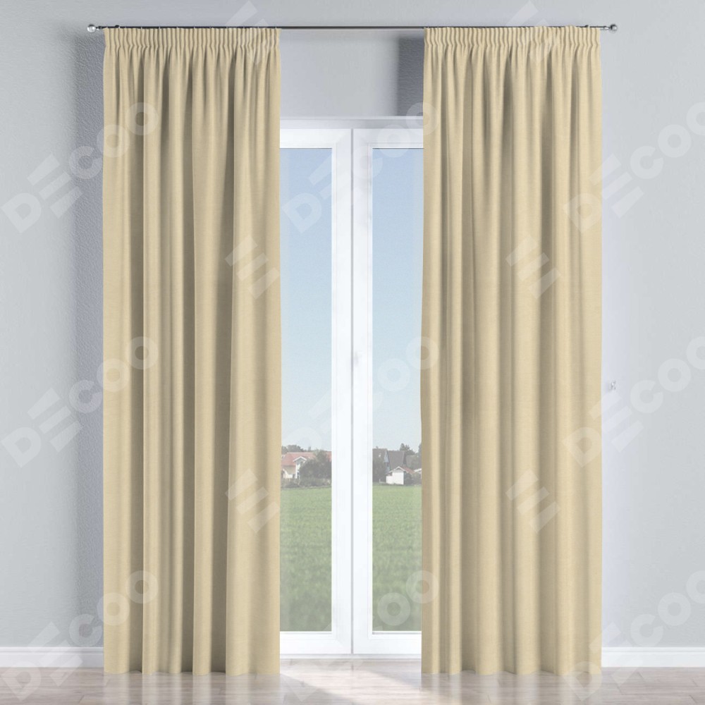 Комплект прямых штор, от производителя «Cortin», пошиты из ткани софт однотонный бежевый лайт, артикул ткани 33100. С изнаночной стороны в верхней части штор пристрачивается шторная лента с декоративными складками «Карандаш». Для создания элегантных складок прямые шторы шьются по стандарту с коэффициентом 1:2 (на 100 см. ширины проёма 200 см. ширины ткани).