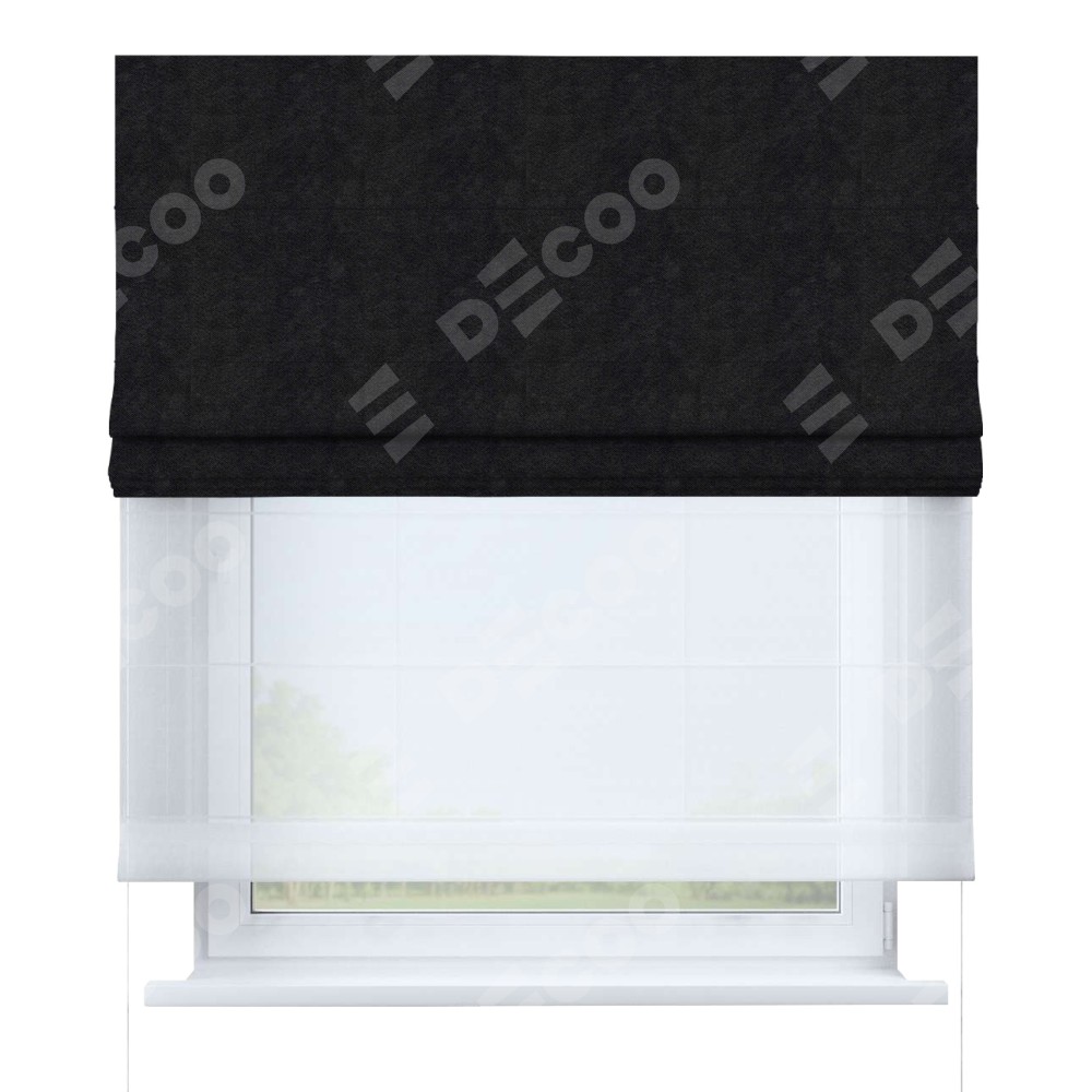 Римская штора день-ночь производителя «Cortin», используется для проёма, пошита из двух полотен, с лицевой стороны cotton блэкаут тёмно-серый артикул 35282, вторая ткань тюль (по стандарту комплектуется тюль белого цвета артикул V-01). Имеет универсальный механизм и подходит для монтажа: на потолок, на стену и в нишу.