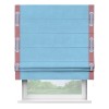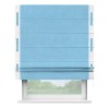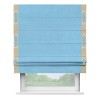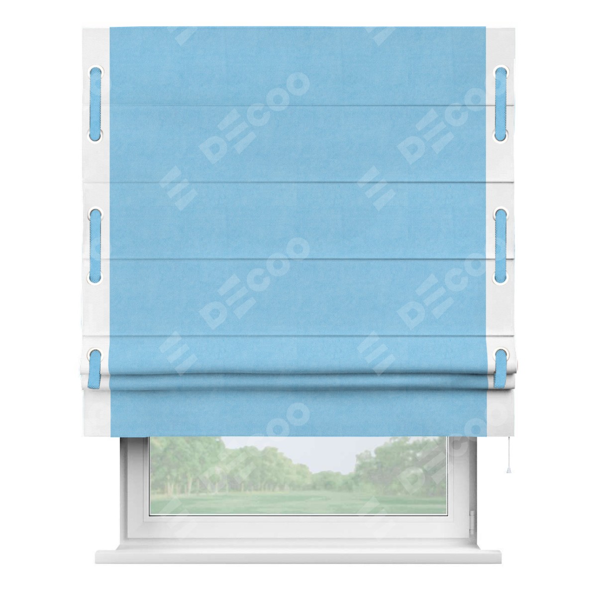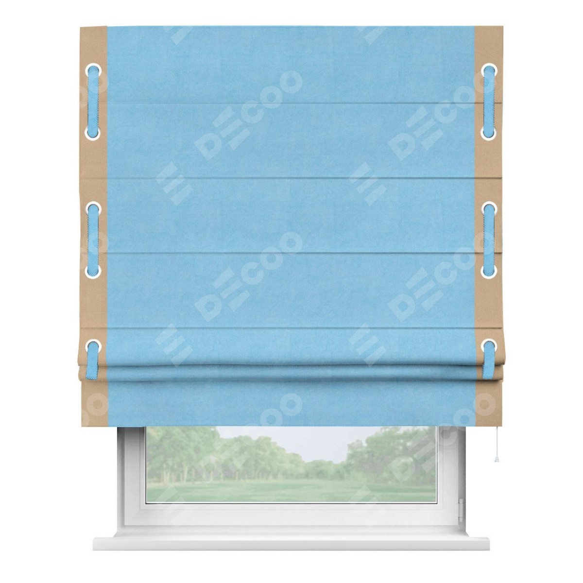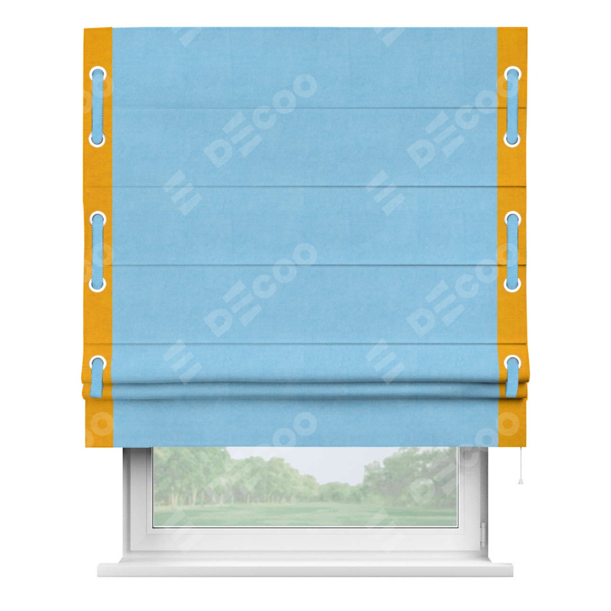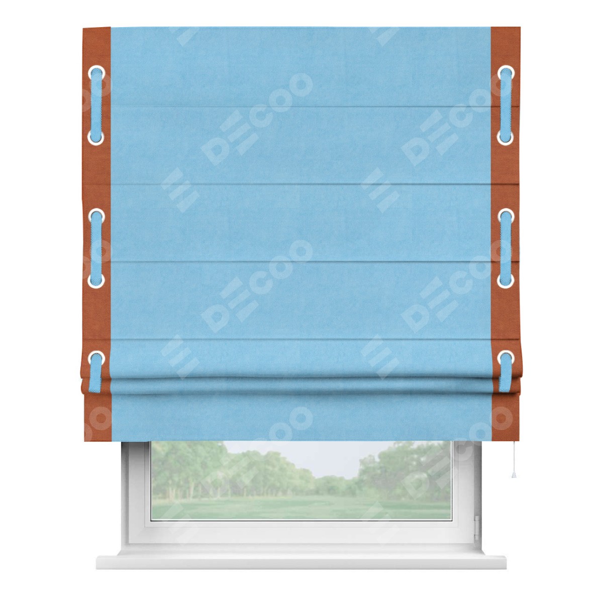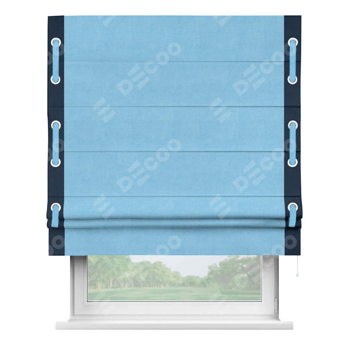 Римская штора производителя «Cortin», используется для проёма, пошита из ткани вельвет голубой, артикул ткани 85544. Отделка шторы кантом «Стрим Дуо» на кантах расположены люверсы с пояском, ткань для канта используется из вельвета разной расцветки на выбор. Ткань для пояска обычно используется из основной ткани шторы, а так же можно сделать из любой расцветки по желанию. Имеет универсальный механизм и подходит для монтажа: на потолок, на стену и в нишу.