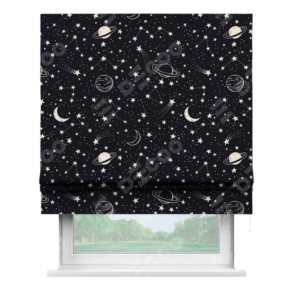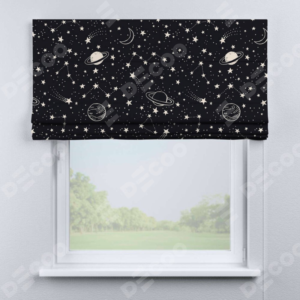 Римская штора производителя «Cortin», используется для проёма, пошита из ткани блэкаут с нанесением сублимационной печати «Глубокий космос». Имеет универсальный механизм и подходит для монтажа: на потолок, на стену и в нишу.