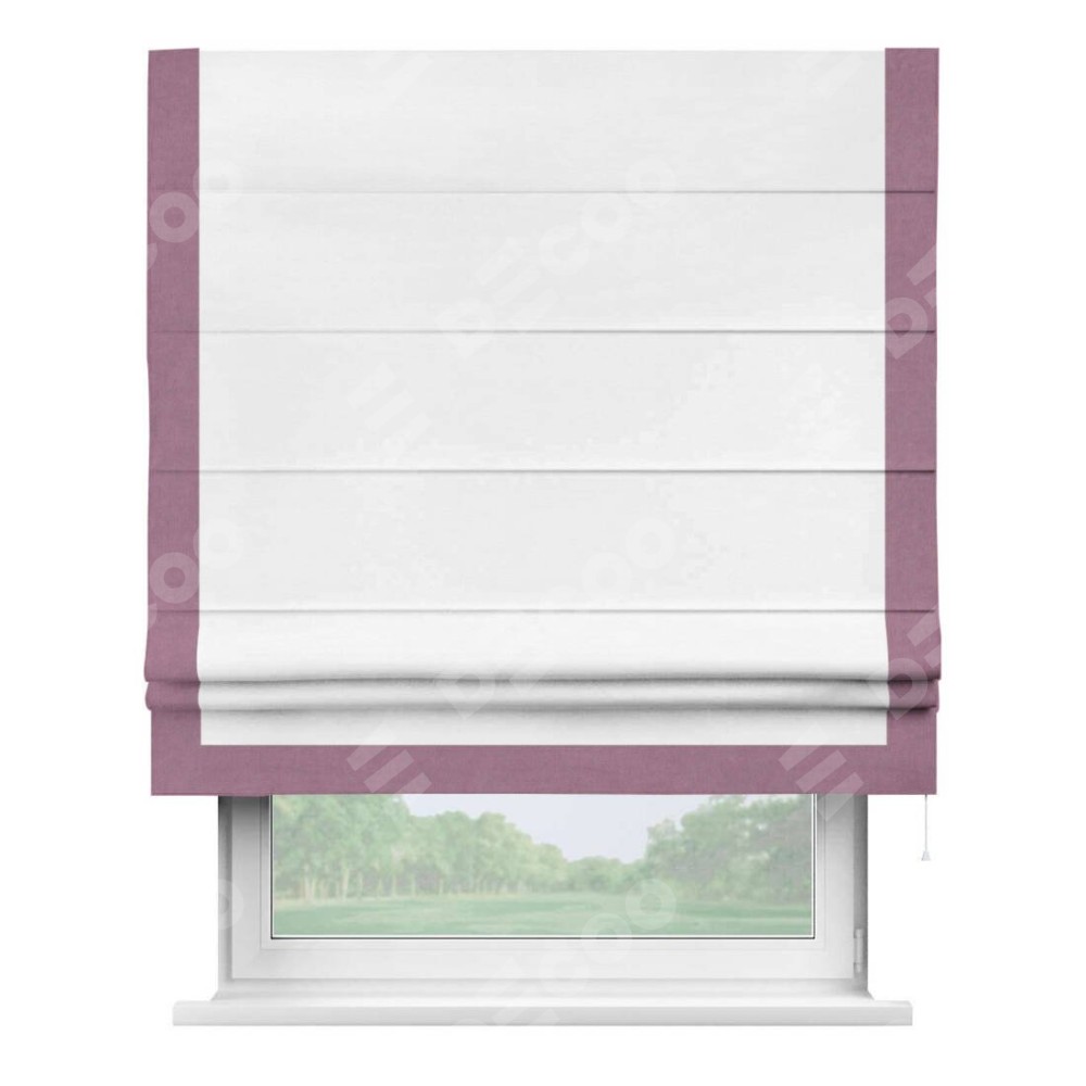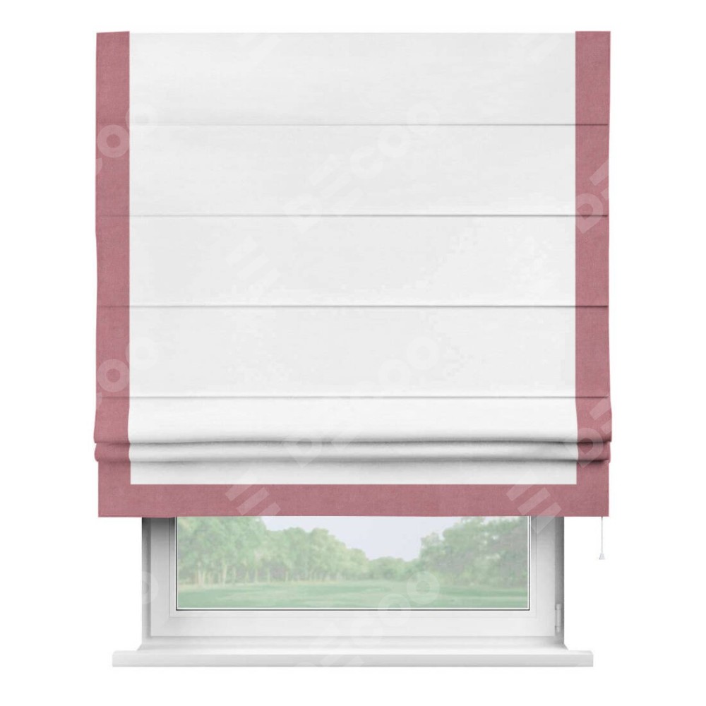 Римская штора производителя «Cortin», используется для проёма, пошита из ткани вельвет дымчато-белый, артикул ткани 85535. Отделка шторы кантом «Виктория», ткань для канта используется из вельвета разной расцветки на выбор. Имеет универсальный механизм и подходит для монтажа: на потолок, на стену и в нишу.