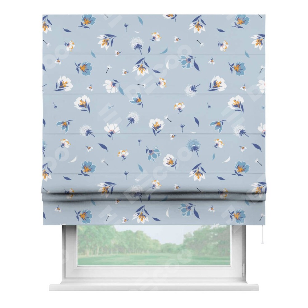 Римская штора производителя «Cortin», используется для проёма, пошита из ткани блэкаут с нанесением сублимационной печати «Голубые цветы». Имеет универсальный механизм и подходит для монтажа: на потолок, на стену и в нишу.