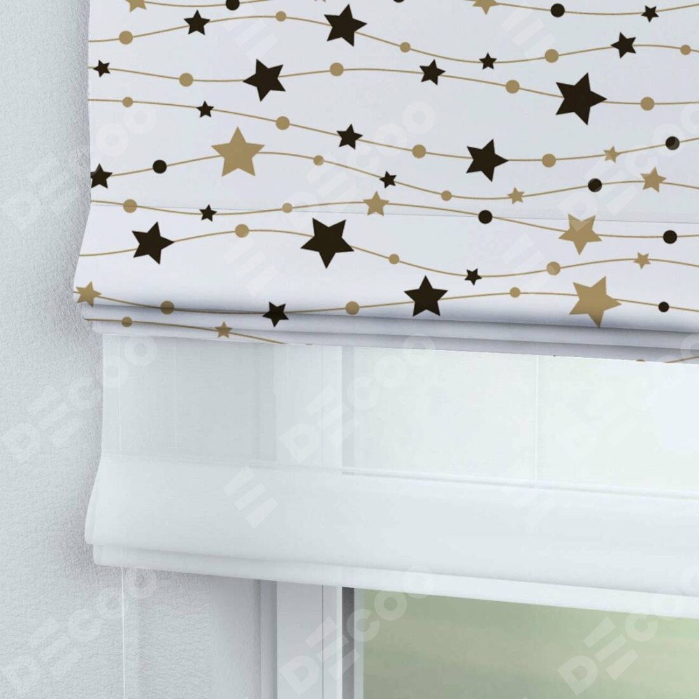 Римская штора день-ночь производителя «Cortin», используется для проёма, пошита из двух полотен, с лицевой блэкаут с нанесением сублимационной печати «Звёздная нить», вторая ткань тюль (по стандарту комплектуется тюль белого цвета артикул V-01). Имеет универсальный механизм и подходит для монтажа: на потолок, на стену и в нишу.