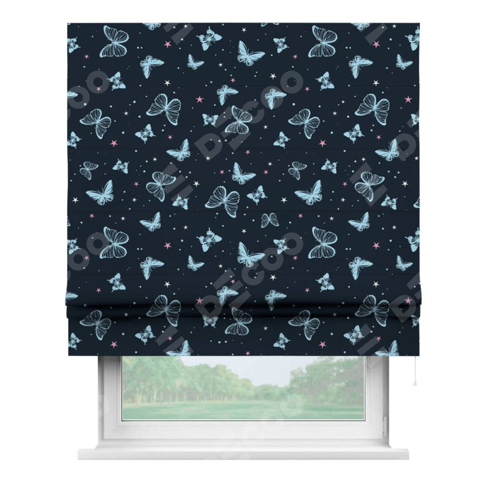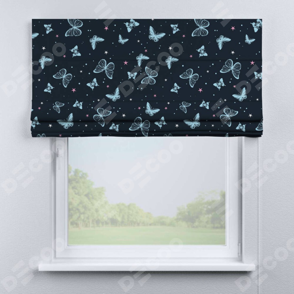 Римская штора производителя «Cortin», используется для проёма, пошита из ткани блэкаут с нанесением сублимационной печати «Неоновые бабочки». Имеет универсальный механизм и подходит для монтажа: на потолок, на стену и в нишу.