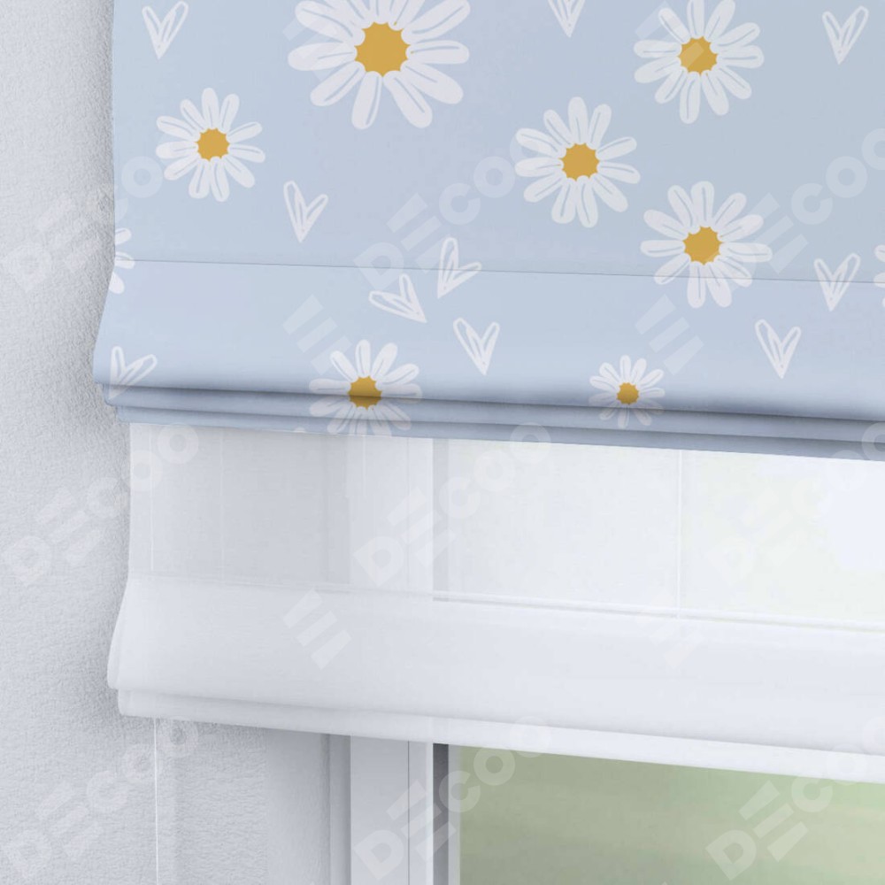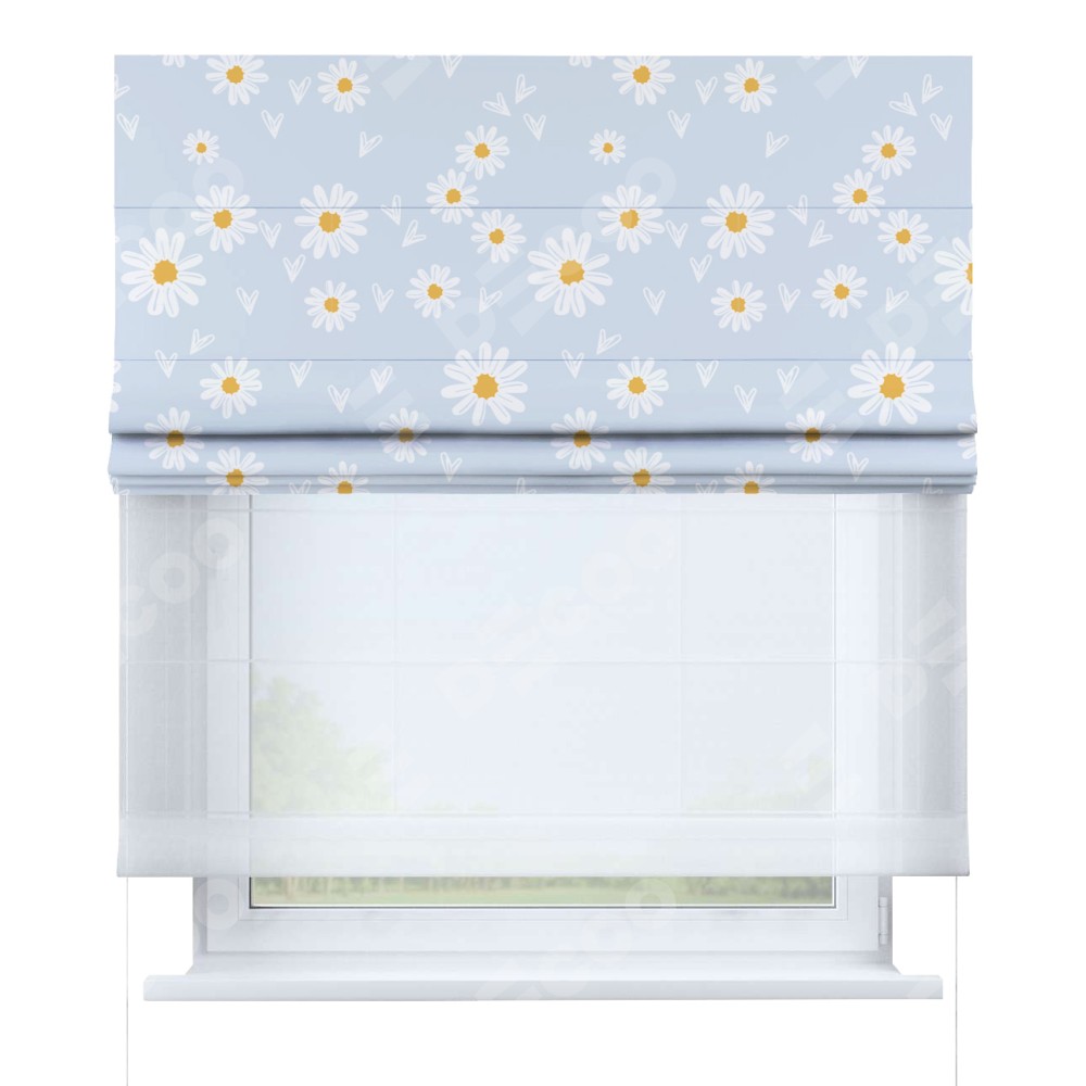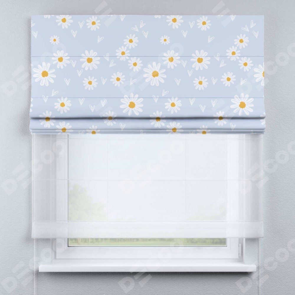 Римская штора день-ночь производителя «Cortin», используется для проёма, пошита из двух полотен, с лицевой блэкаут с нанесением сублимационной печати «Летние ромашки», вторая ткань тюль (по стандарту комплектуется тюль белого цвета артикул V-01). Имеет универсальный механизм и подходит для монтажа: на потолок, на стену и в нишу.